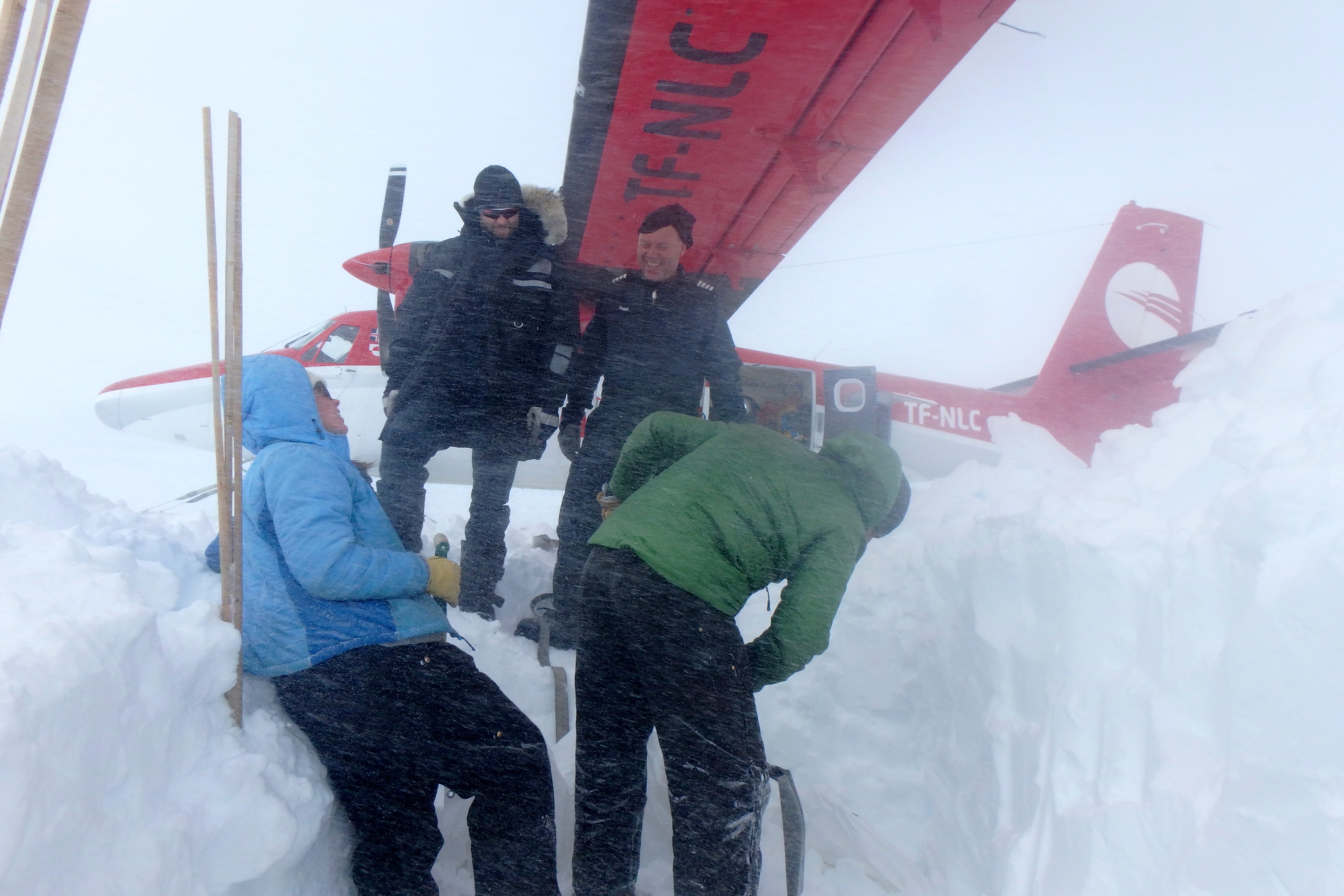 The team digs out ice cores that were stashed in a remote portion of the Greenland Ice Sheet by a traversing group.