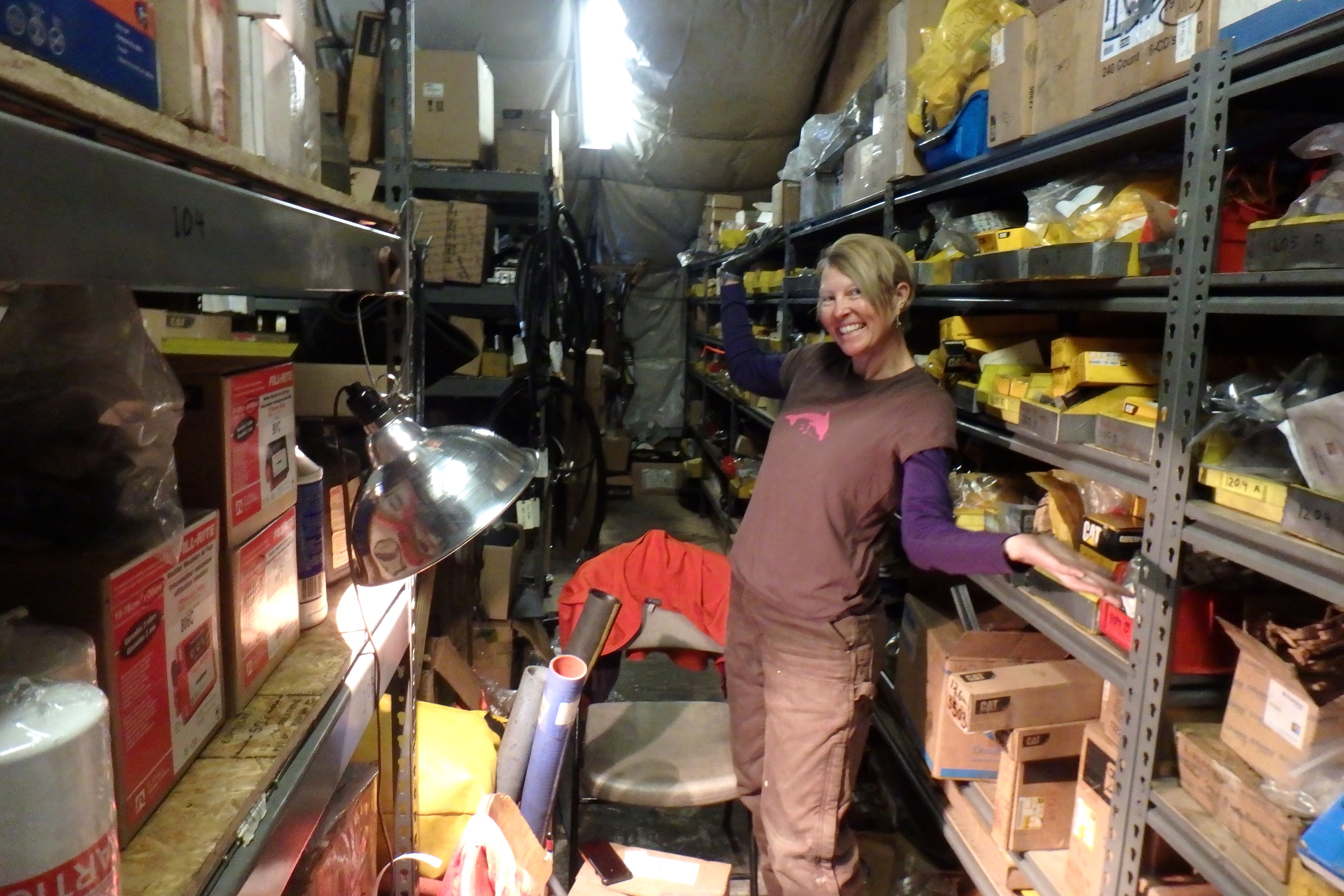 Rachel Murray shows off the parts storage area of the Science and Operation Building. Summit Station, Greenland.