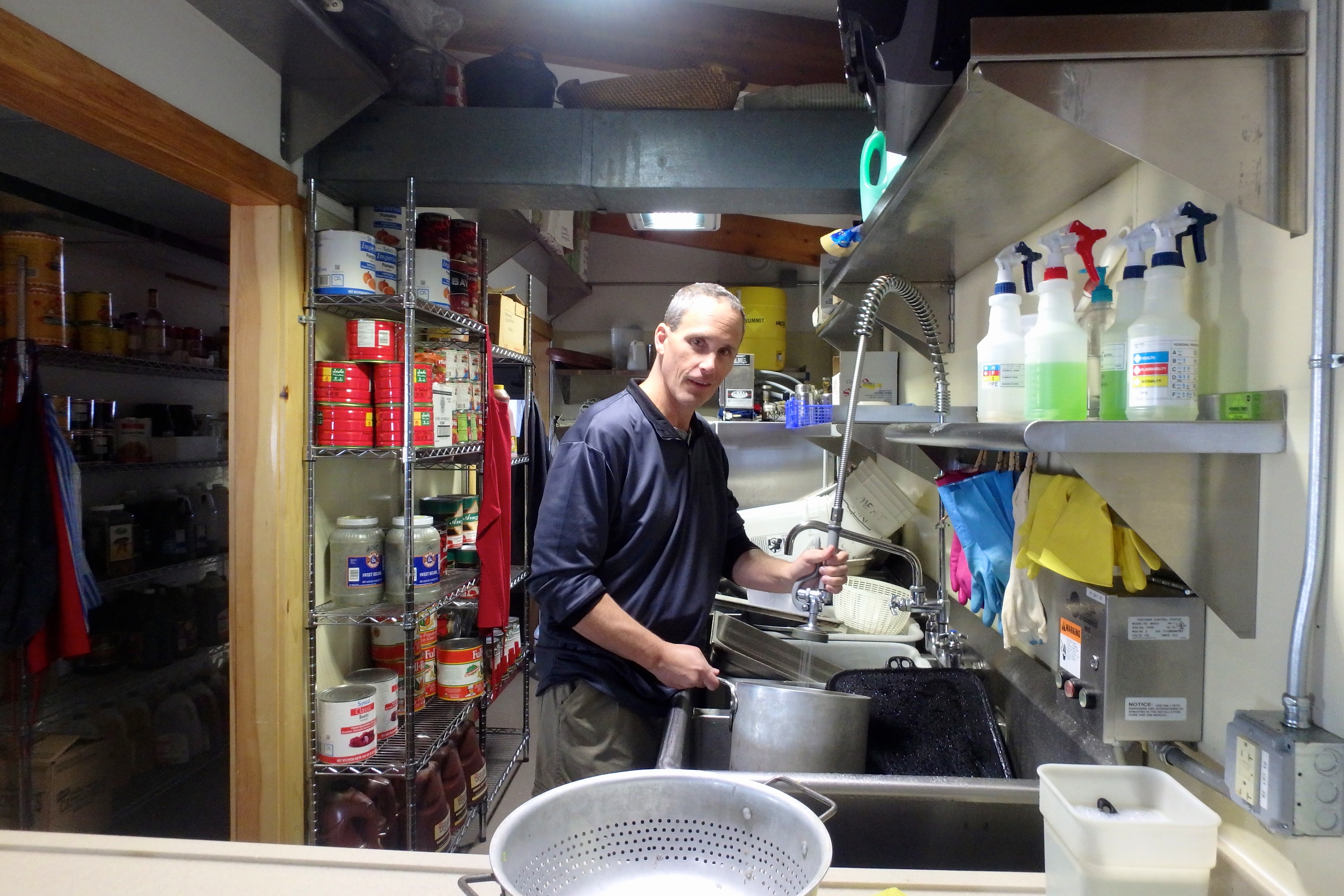 As part of his duties as "House Mouse" at Summit Station, Greenland, PolarTREC teacher Steve Kirsche washes dishes.