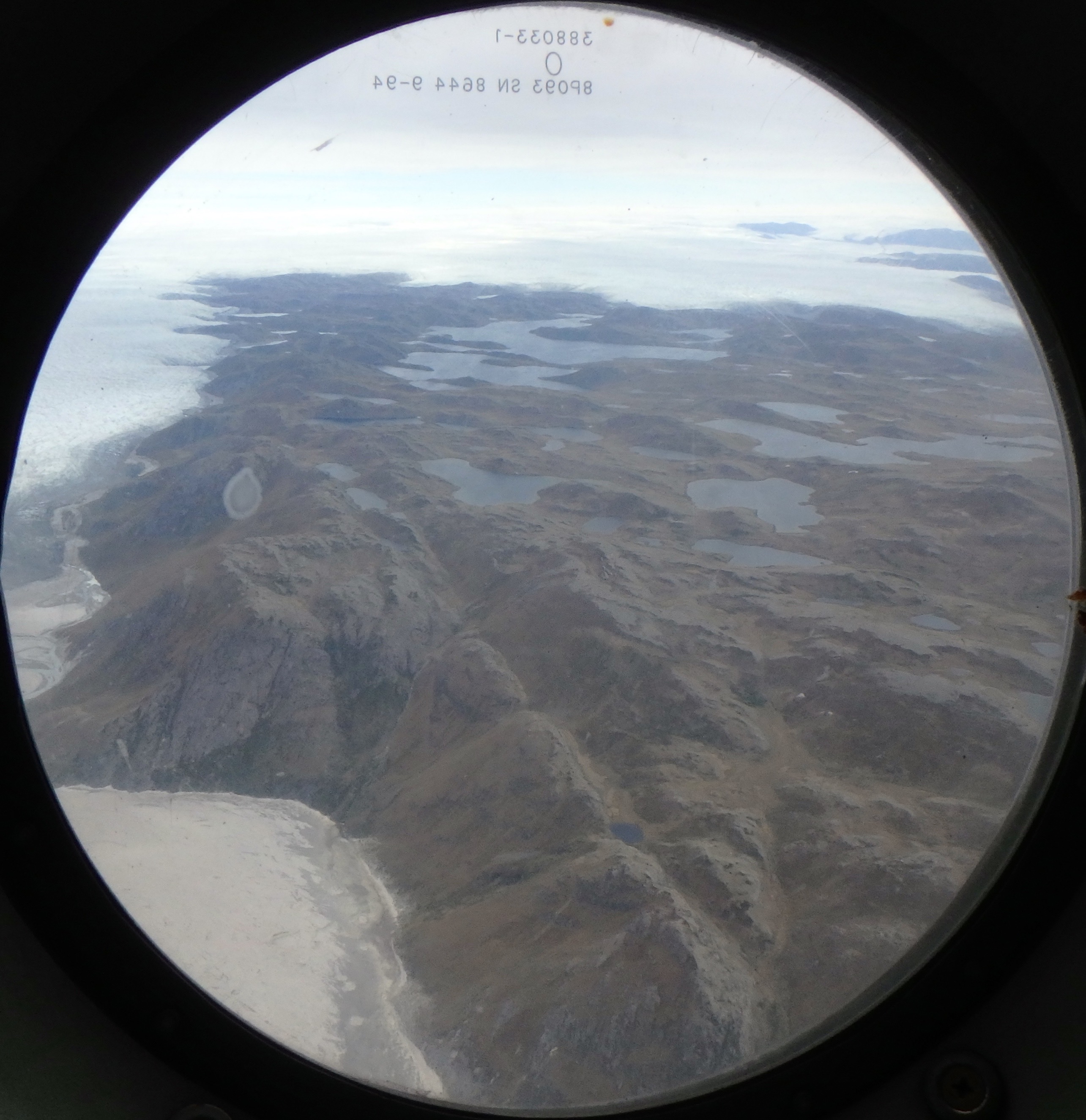 The edge of the Greenland Ice Sheet can be seen out the window of the LC-130 airplane.