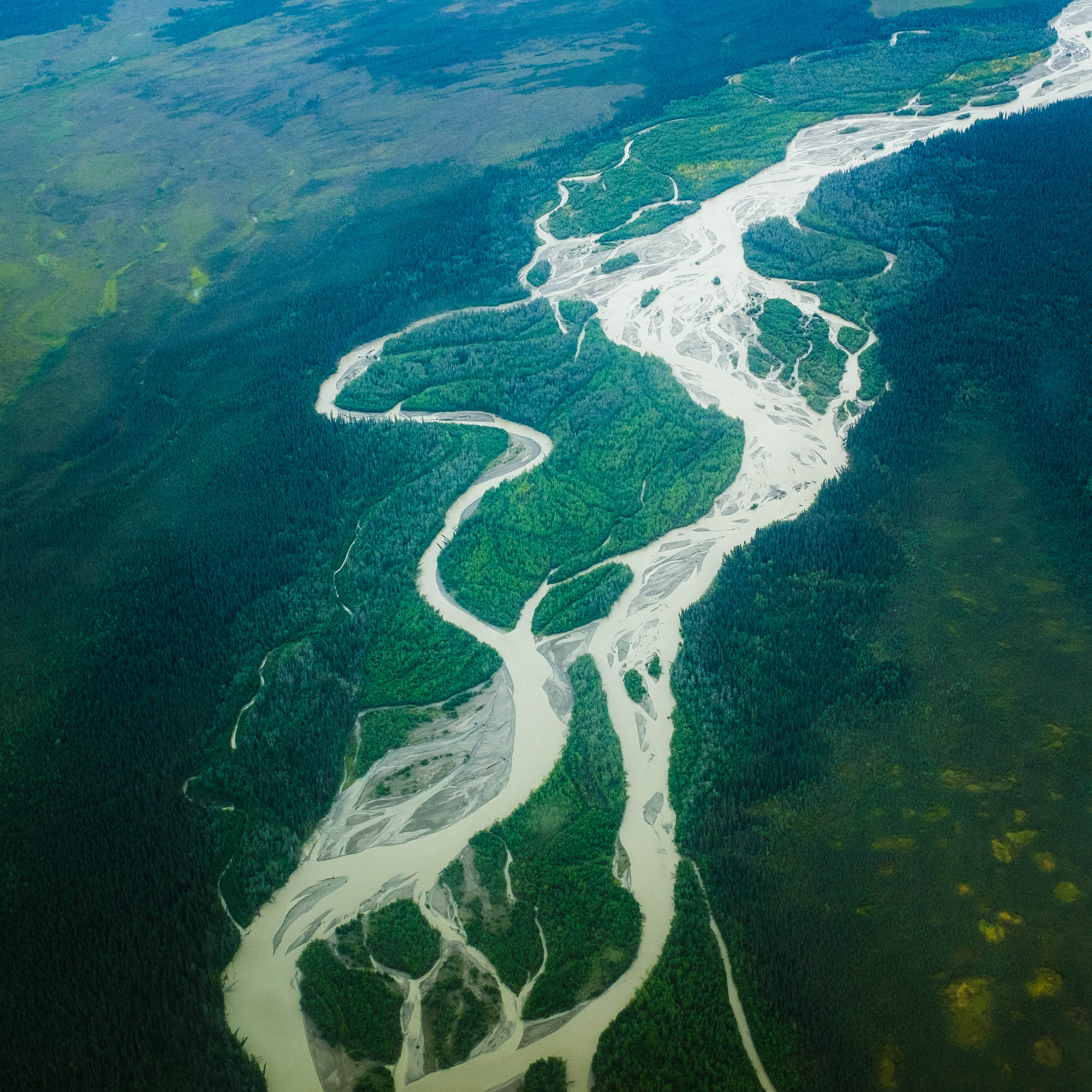 A view of a braided river en route to Nikolai, Alaska.