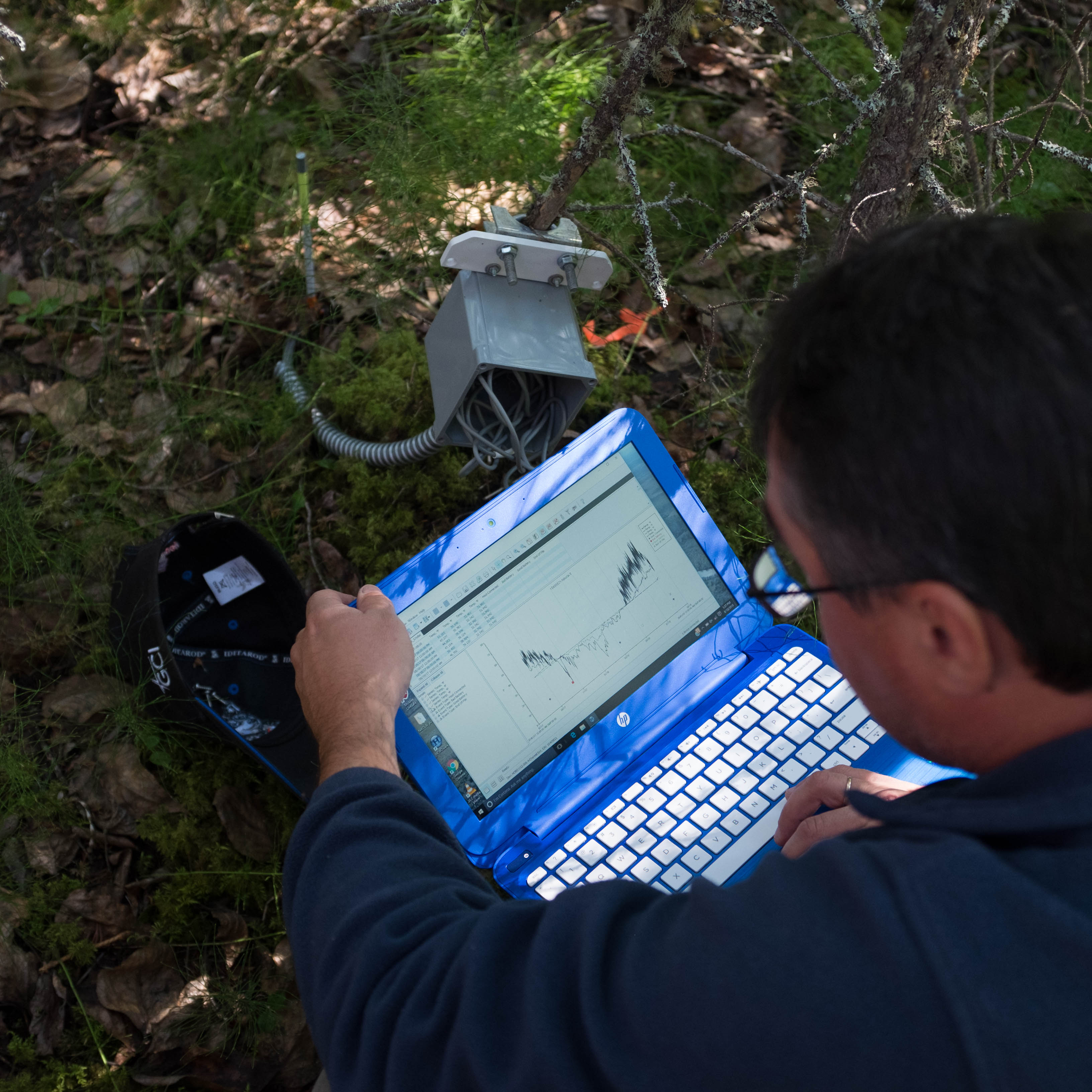 Sasha Kholodov downloads ground temperature data from a permafrost monitoring station. Nikolai, Alaska.