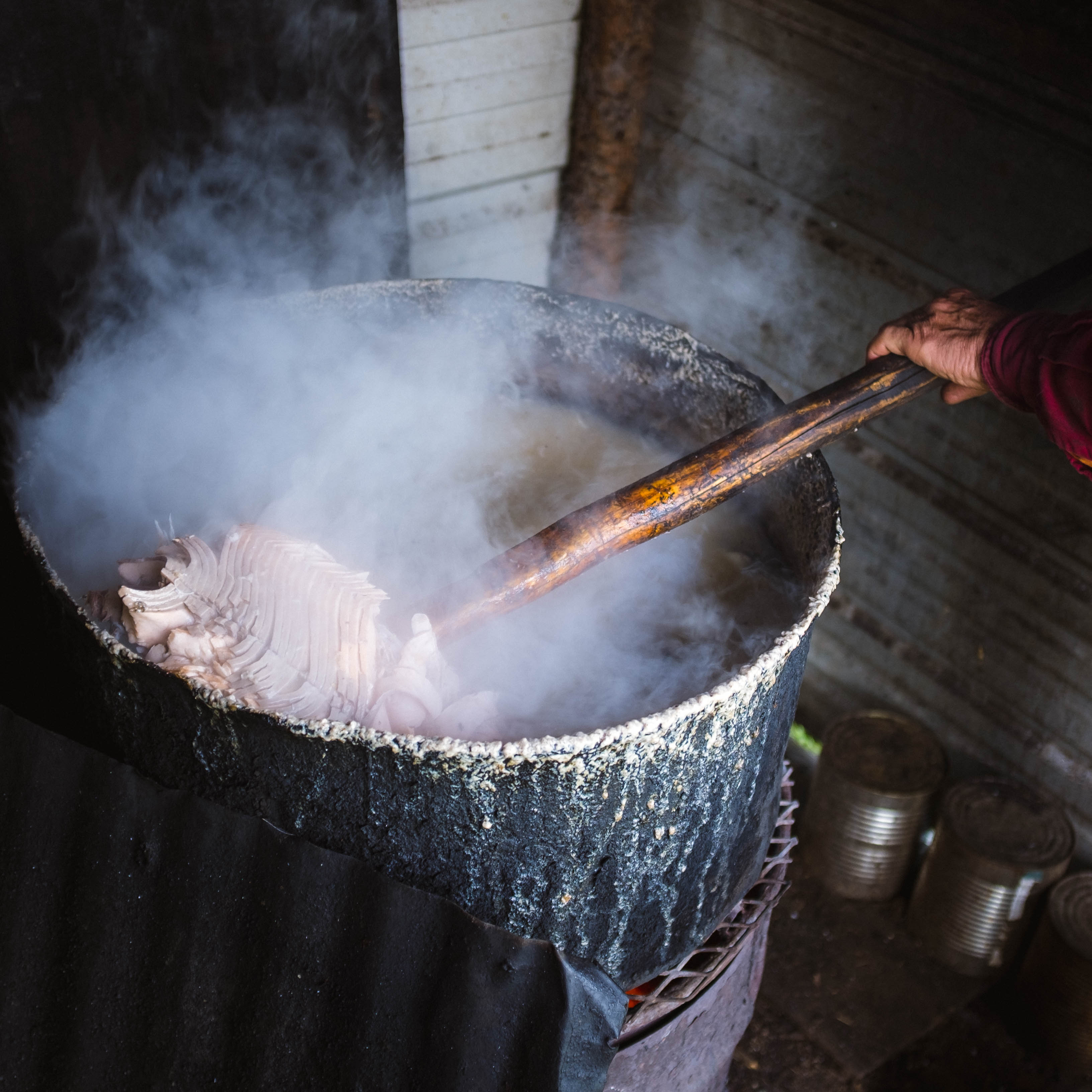 Fresh salmon is cooked up to make food for a dog team owned by a Nikolai resident named John. Nikolai, Alaska.