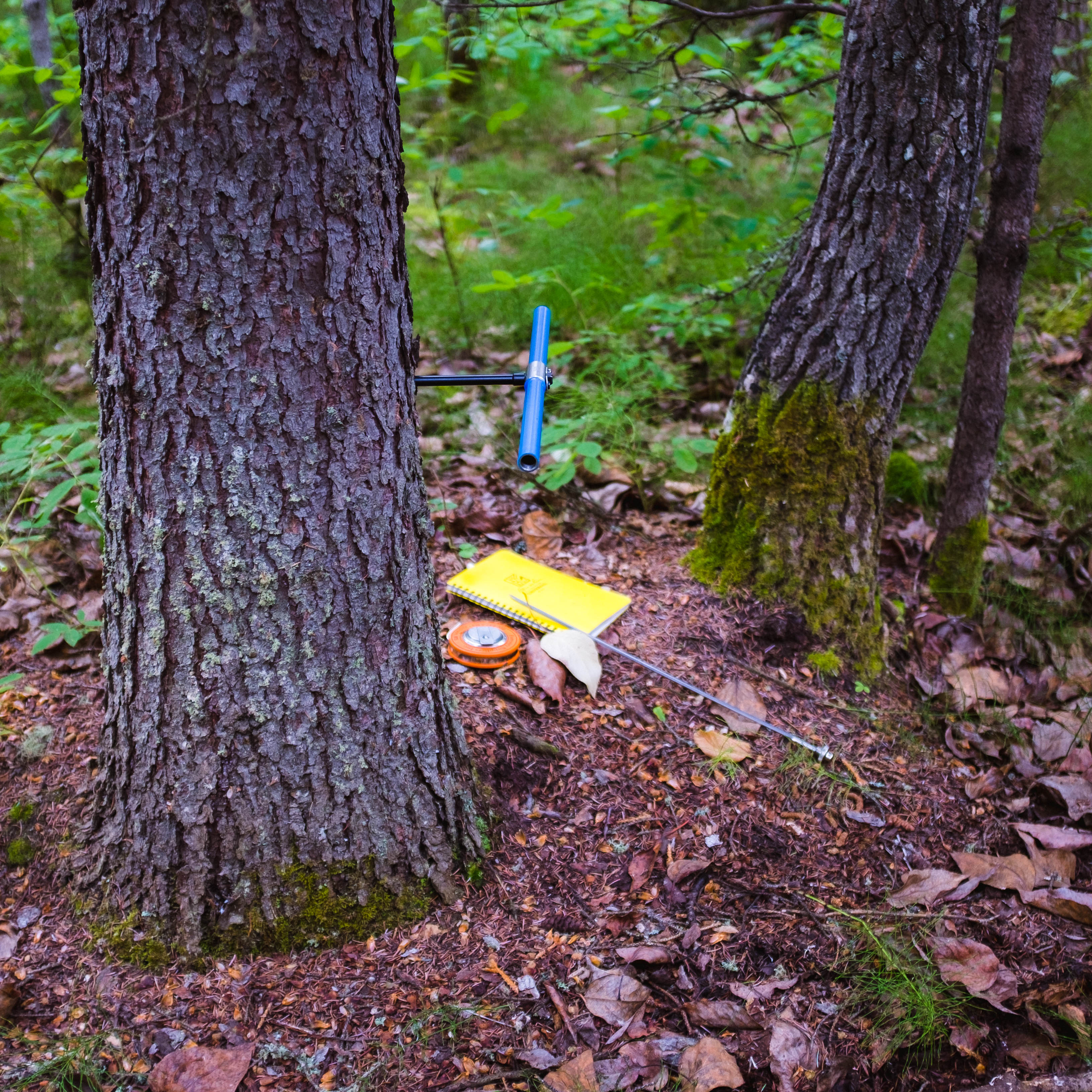 Supplies for taking tree cores lay at a tree. Nikolai, Alaska.
