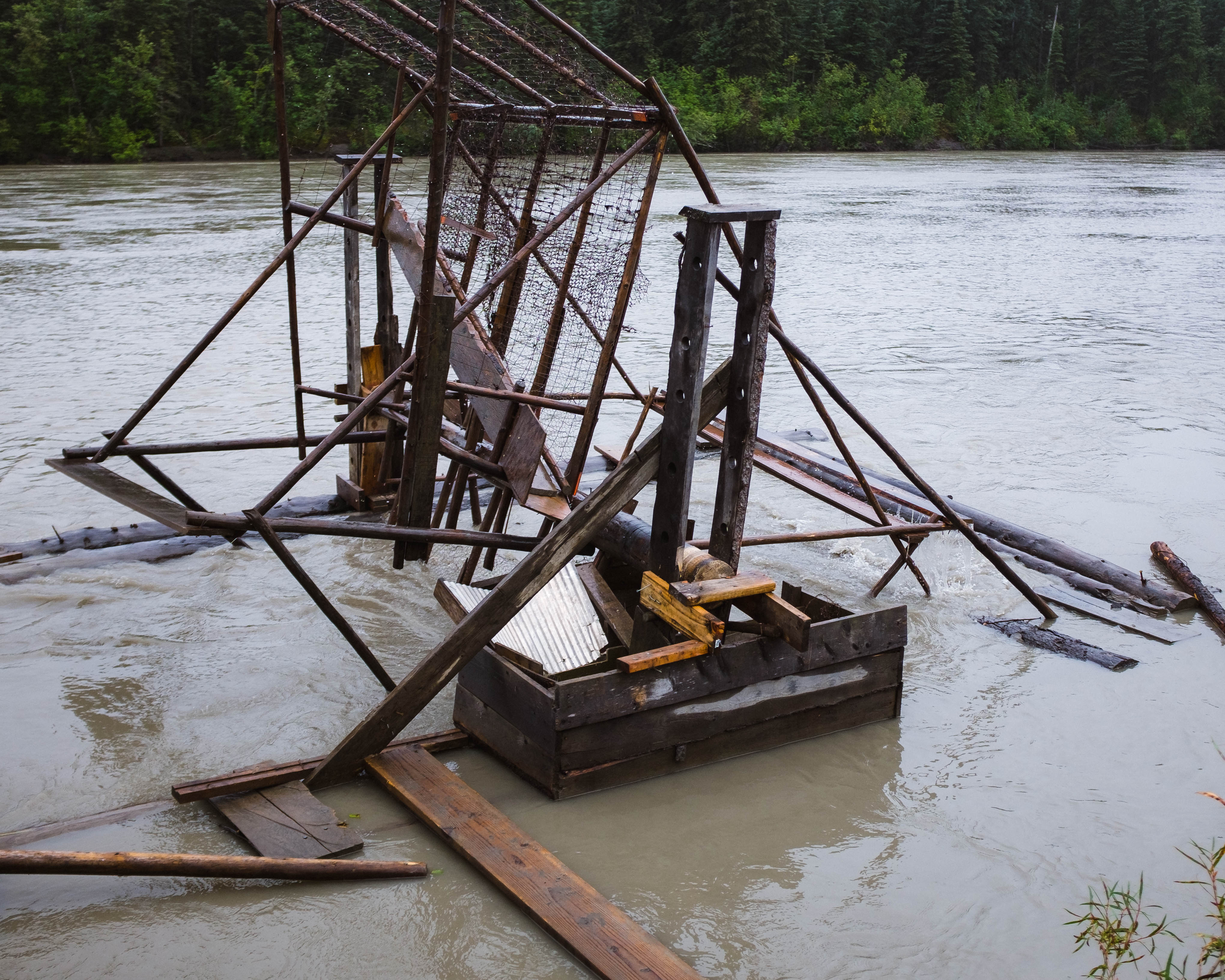A view of the fish wheel on the South Fork Kuskokwim River in Nikolai, Alaska.