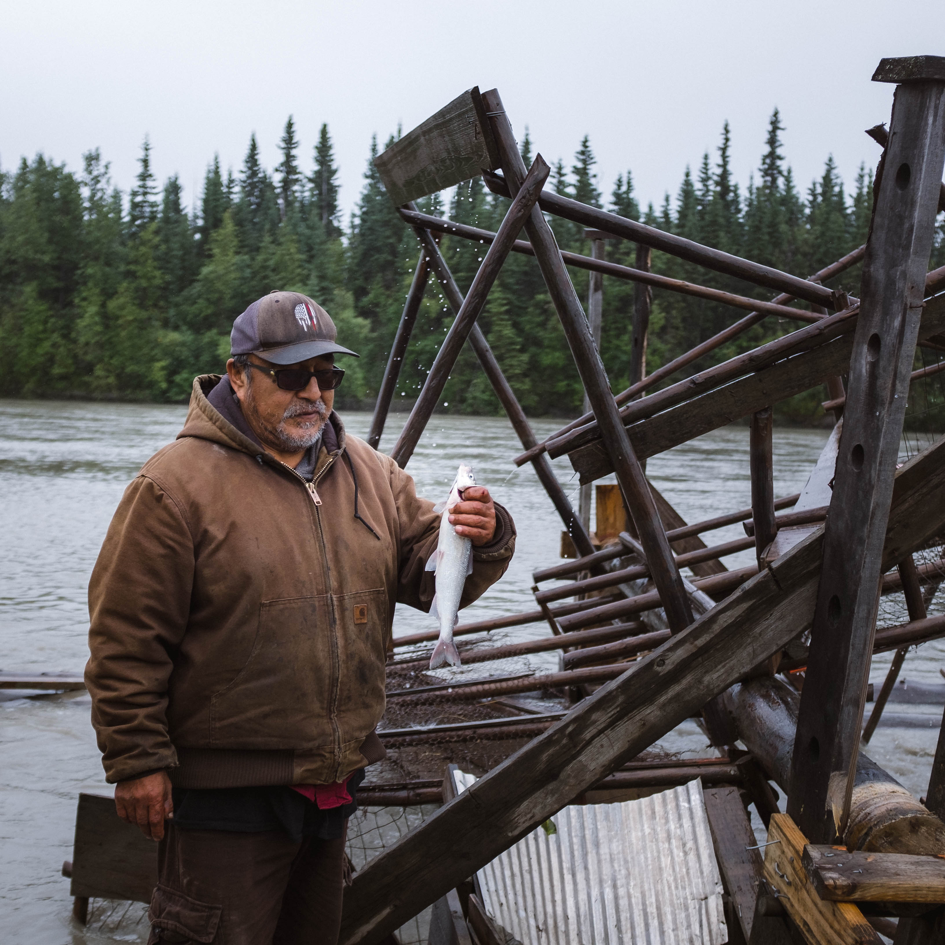 Bernie, a local resident, stands with a whitefish that was caught in the fish wheel. Nikolai, Alaska.