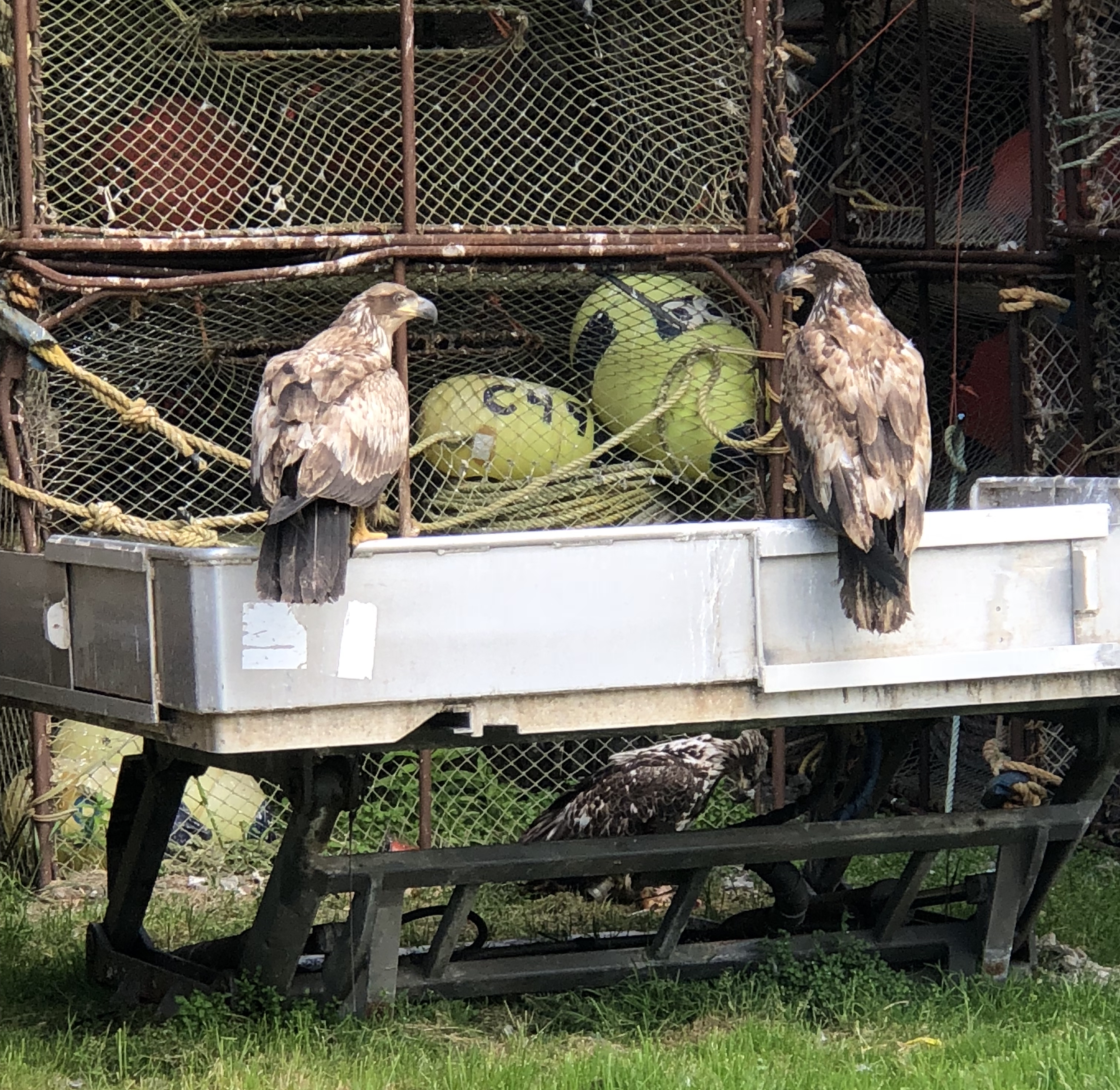 Two eagles on a crab sorting table in Dutch Harbor, Alaska.