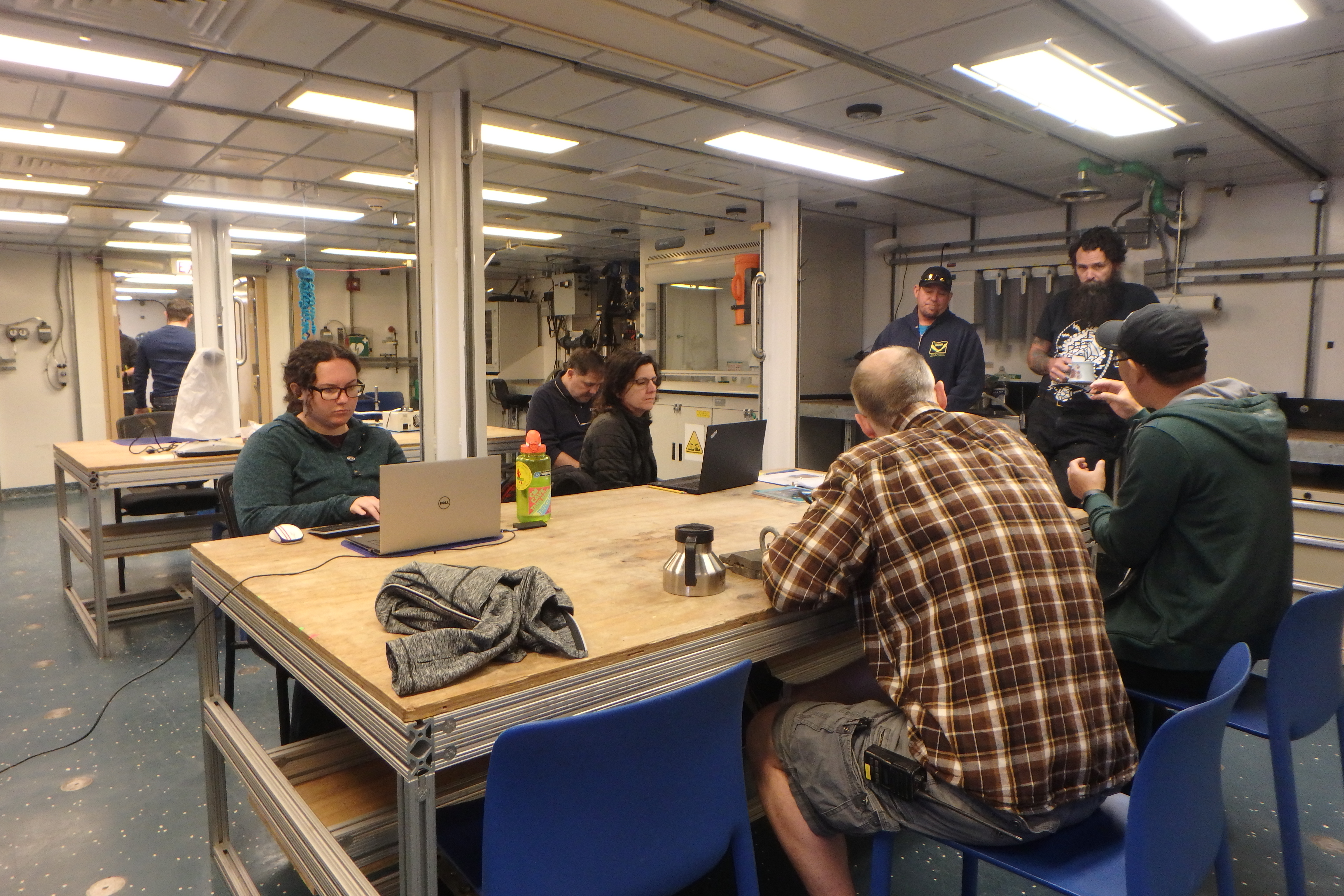A meeting between science and crew aboard the R/V Sikuliaq in the Bering Sea.