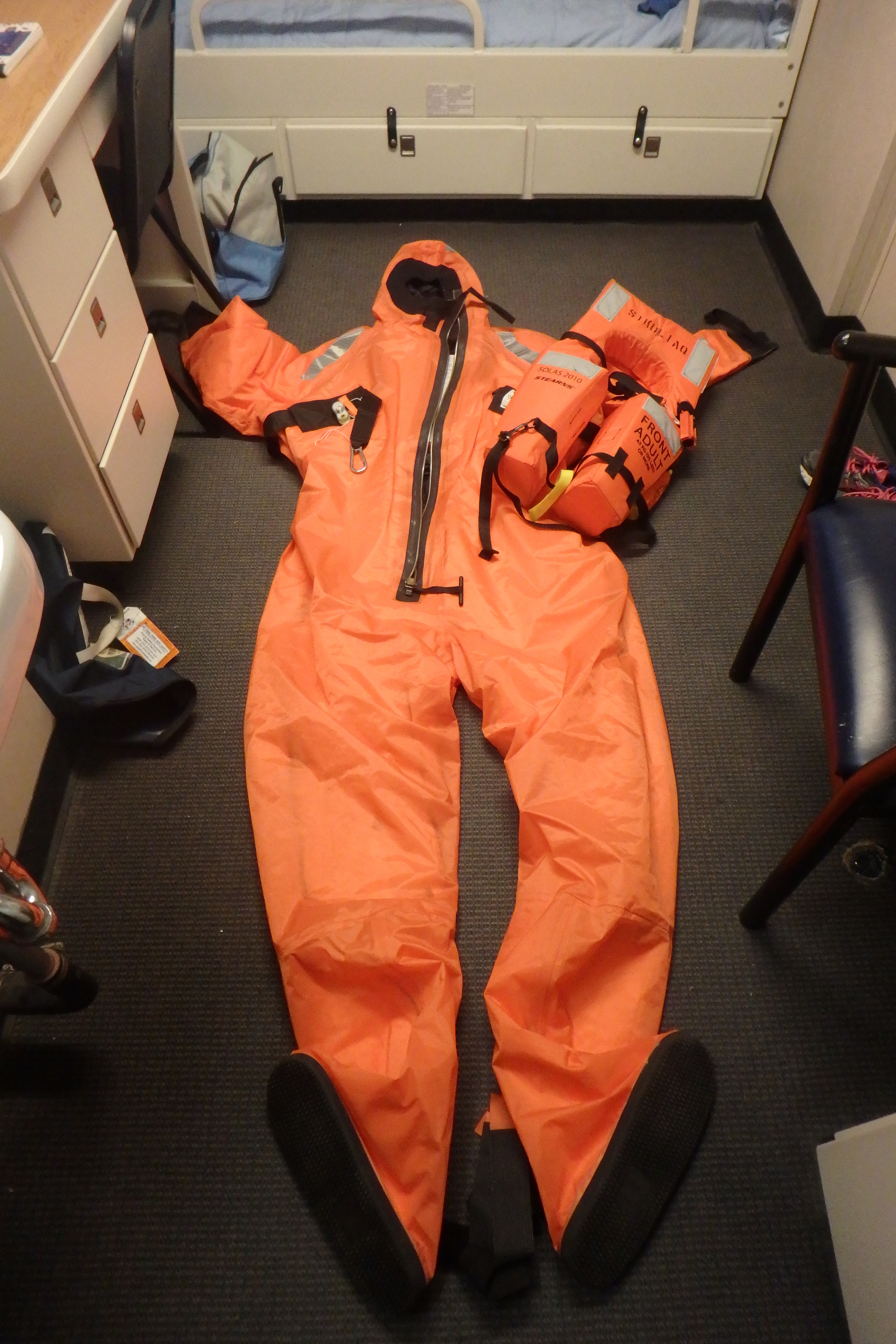 An immersion suit and life vest. Aboard the R/V Sikuliaq in the Bering Sea.