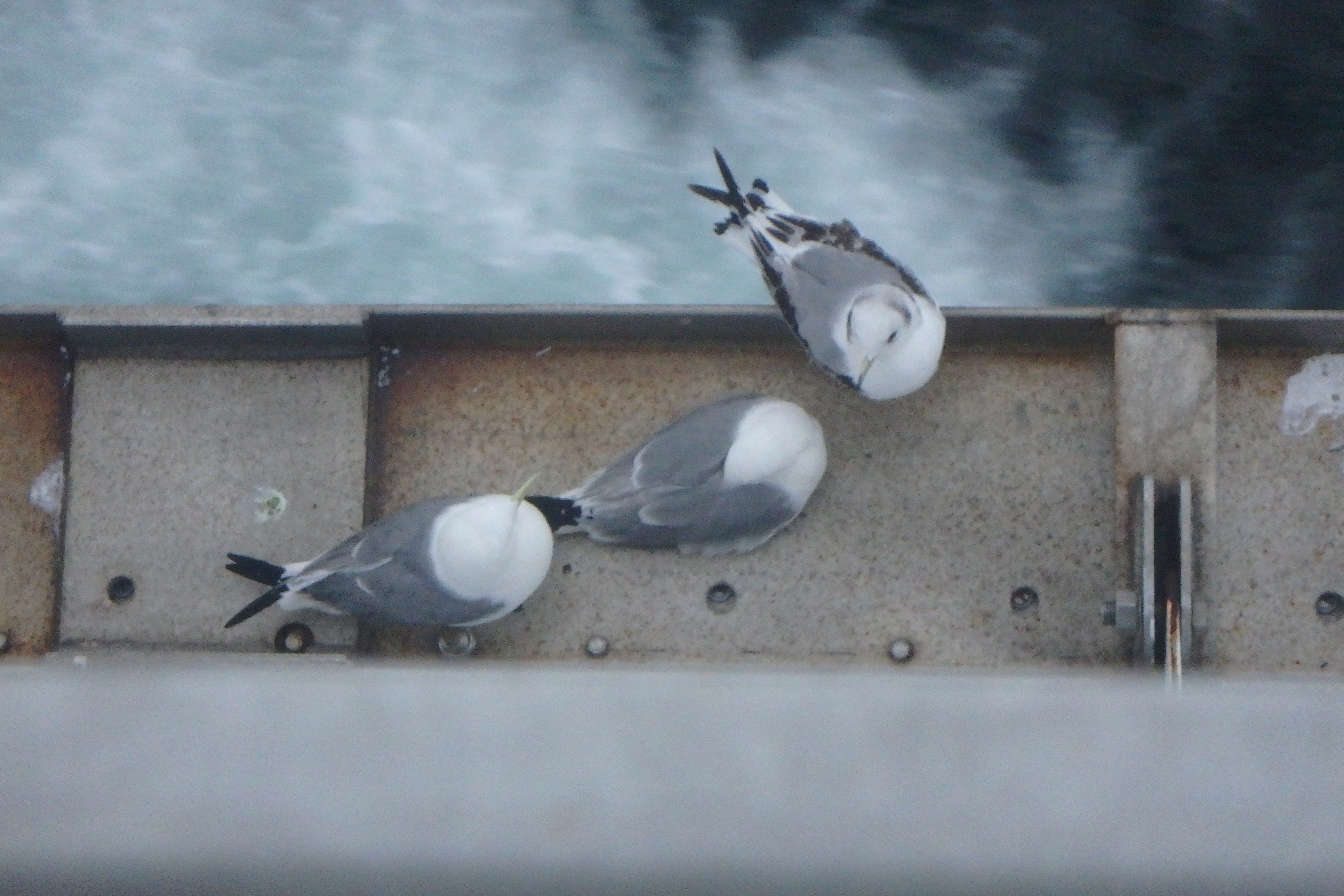 Kittiwakes hitching a ride on the port side of the R/V Sikuliaq in the Bering Sea.