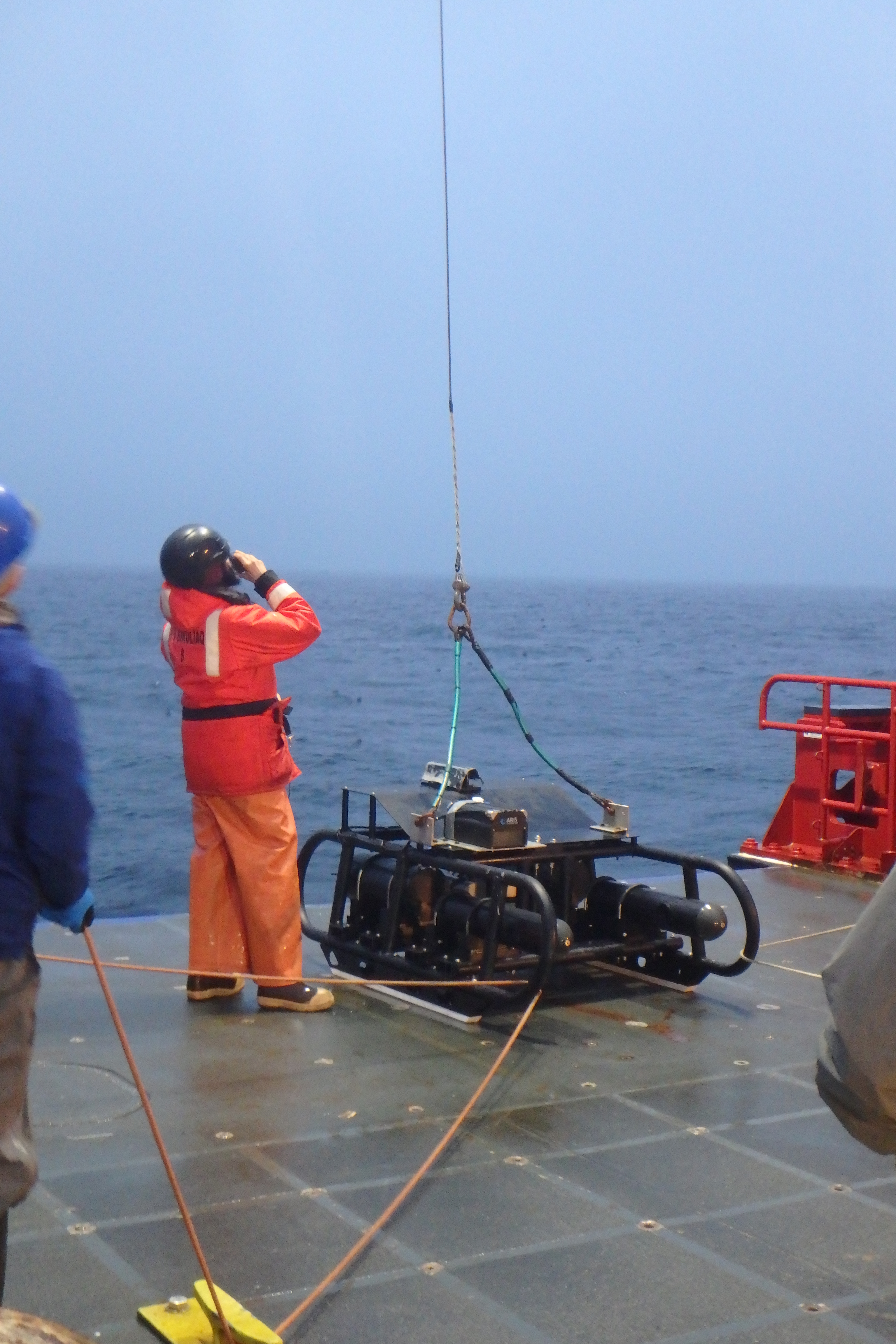 The crew launches the Arcis, which collects sonar data. Aboard the R/V Sikuliaq in the Bering Sea.