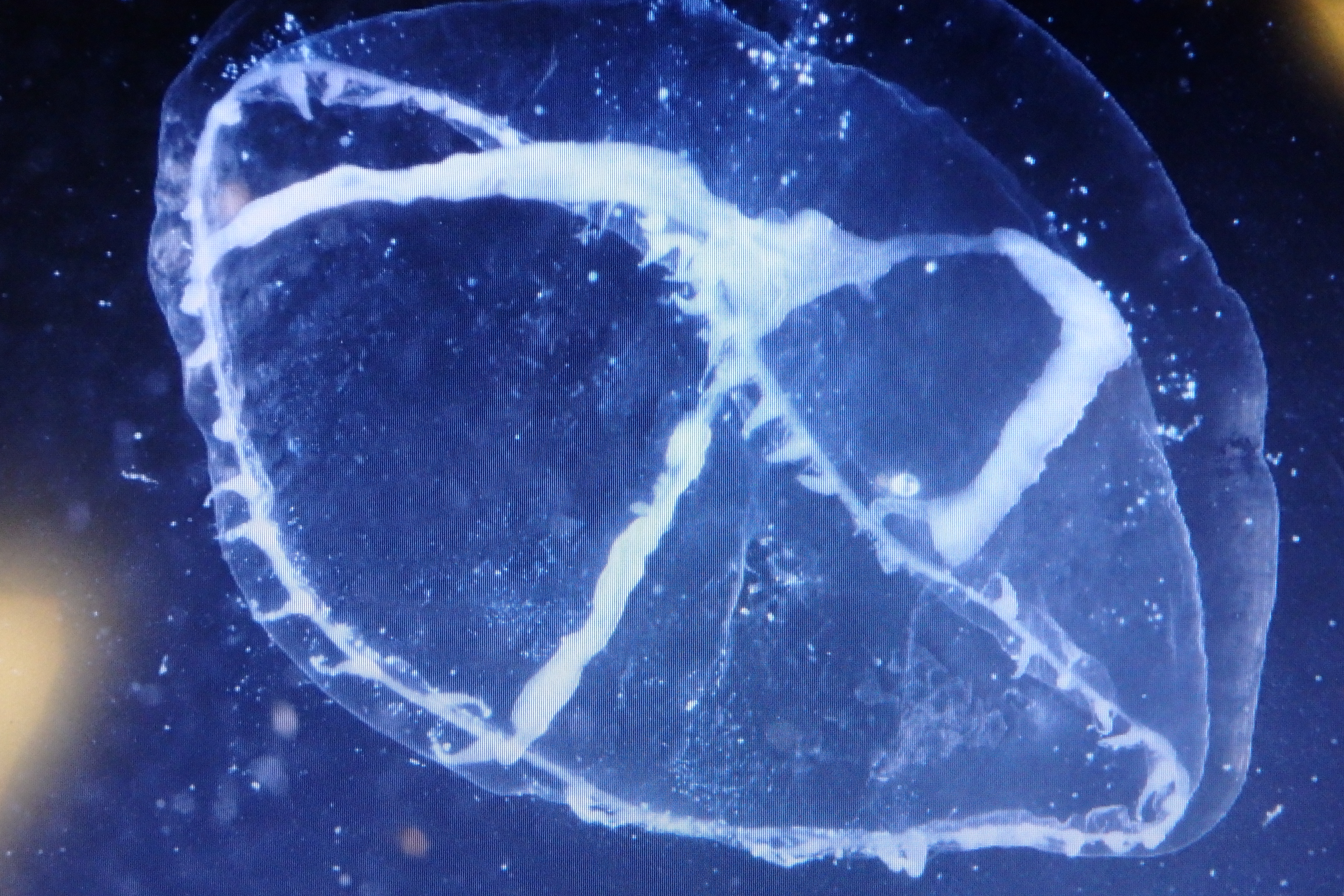 A jellyfish specimen under a microscope that was caught from a net trawl. Aboard the R/V Sikuliaq in the Bering Sea.