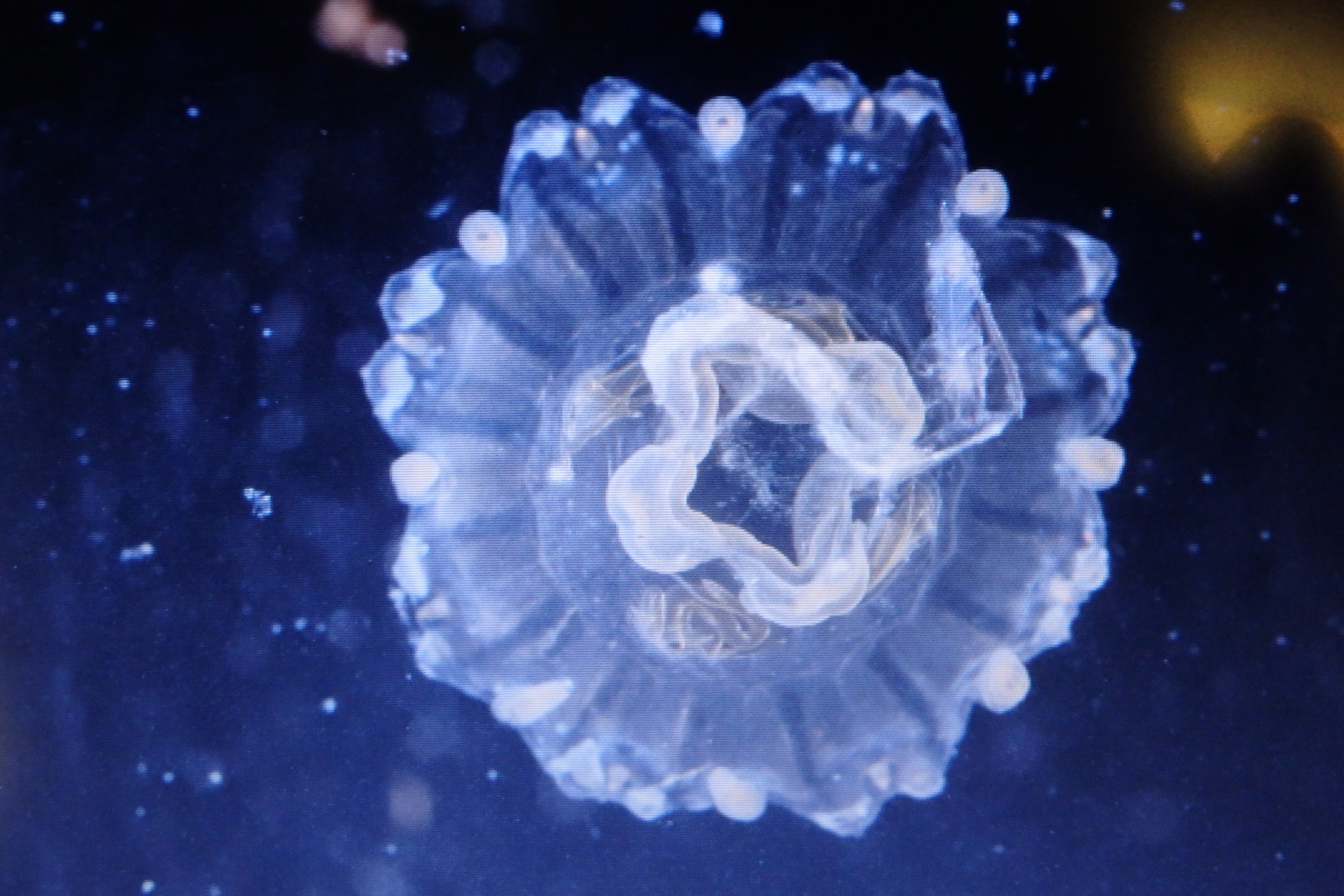A jellyfish specimen under a microscope that was caught from a net trawl. Aboard the R/V Sikuliaq in the Bering Sea.