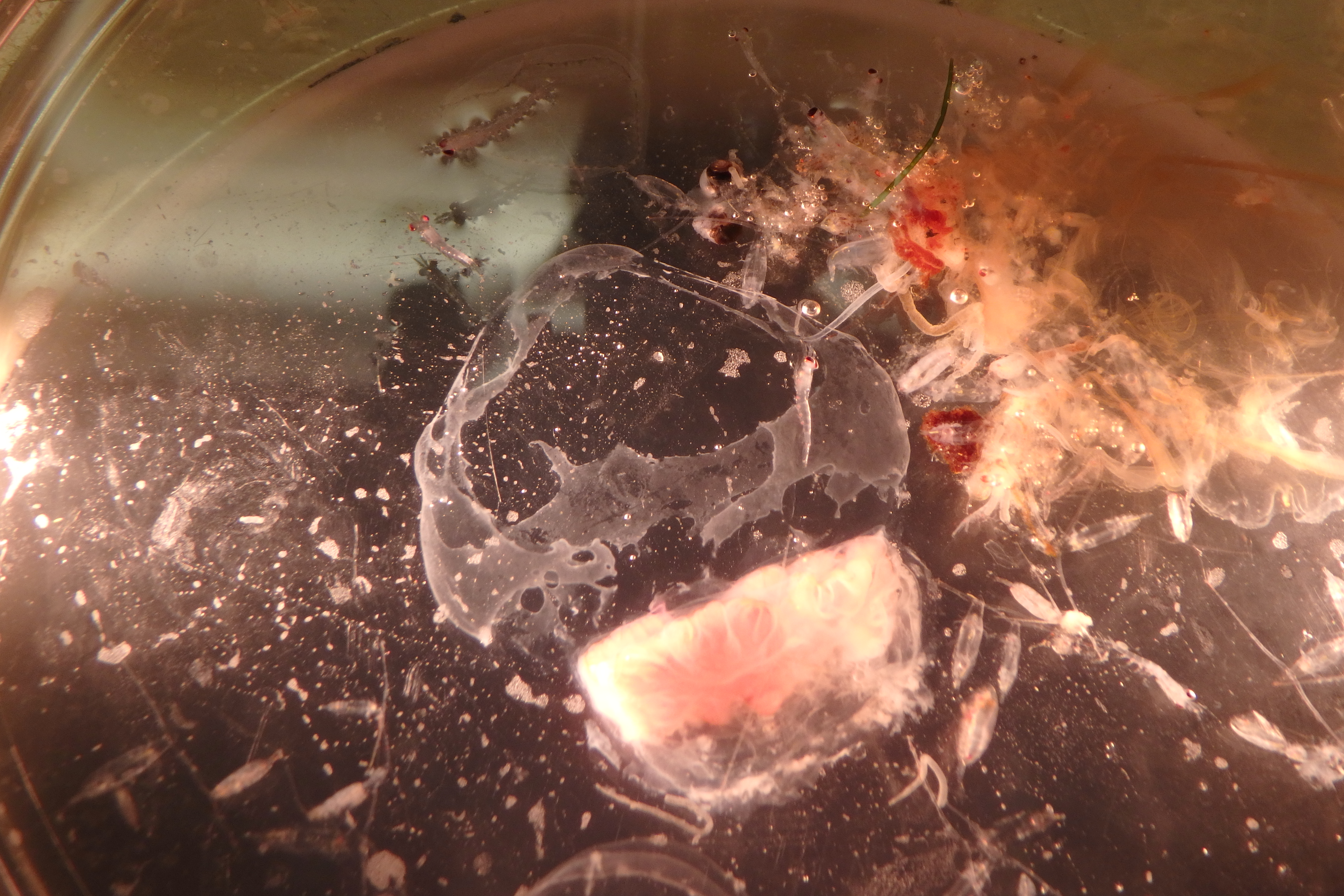 A jellyfish specimen in a petri dish that was caught from a net trawl. Aboard the R/V Sikuliaq in the Bering Sea.