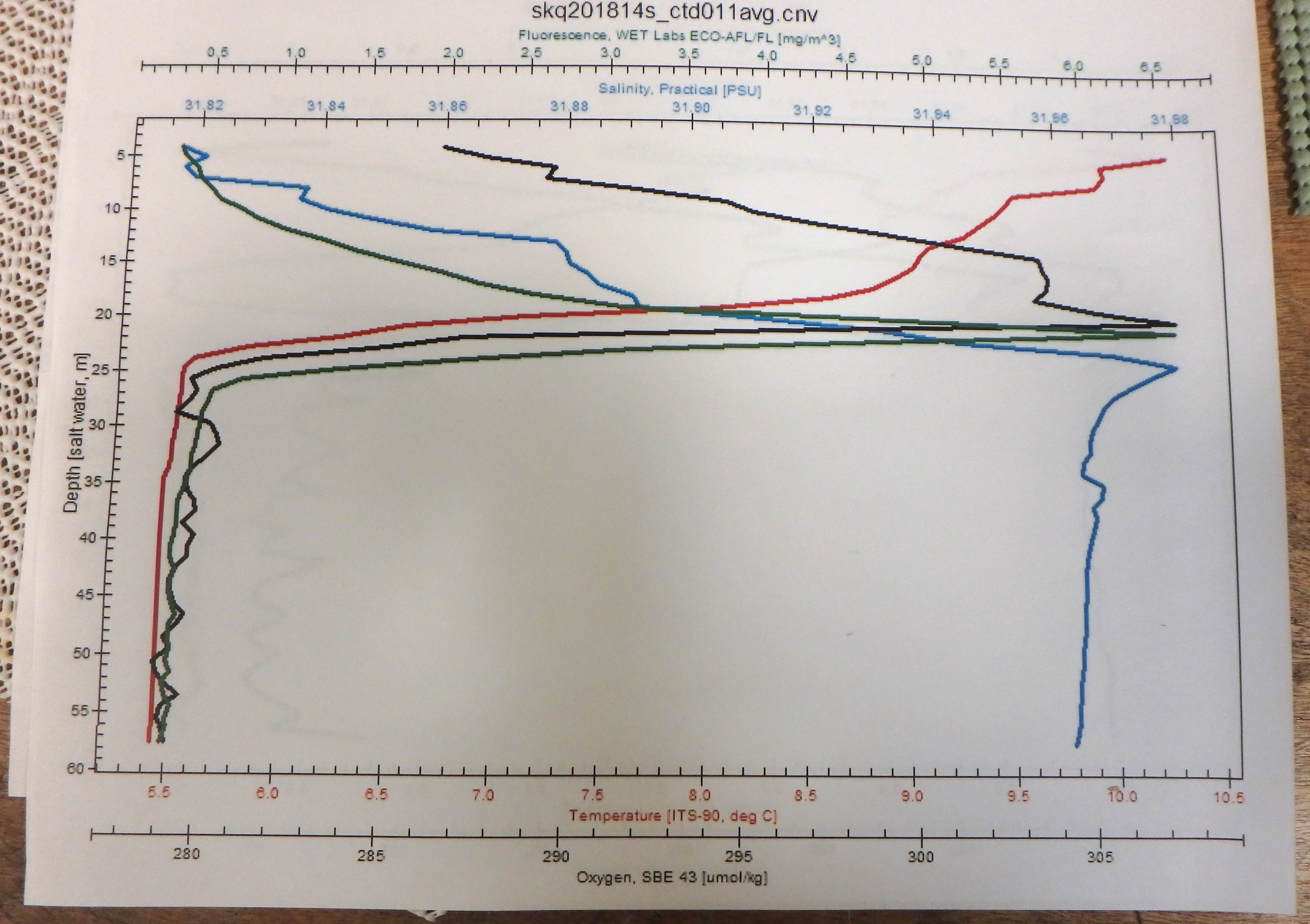 A reading from the CTD instrument plotted out, showing the depth, temperature, and salinity. Aboard the R/V Sikuliaq in the Bering Sea.