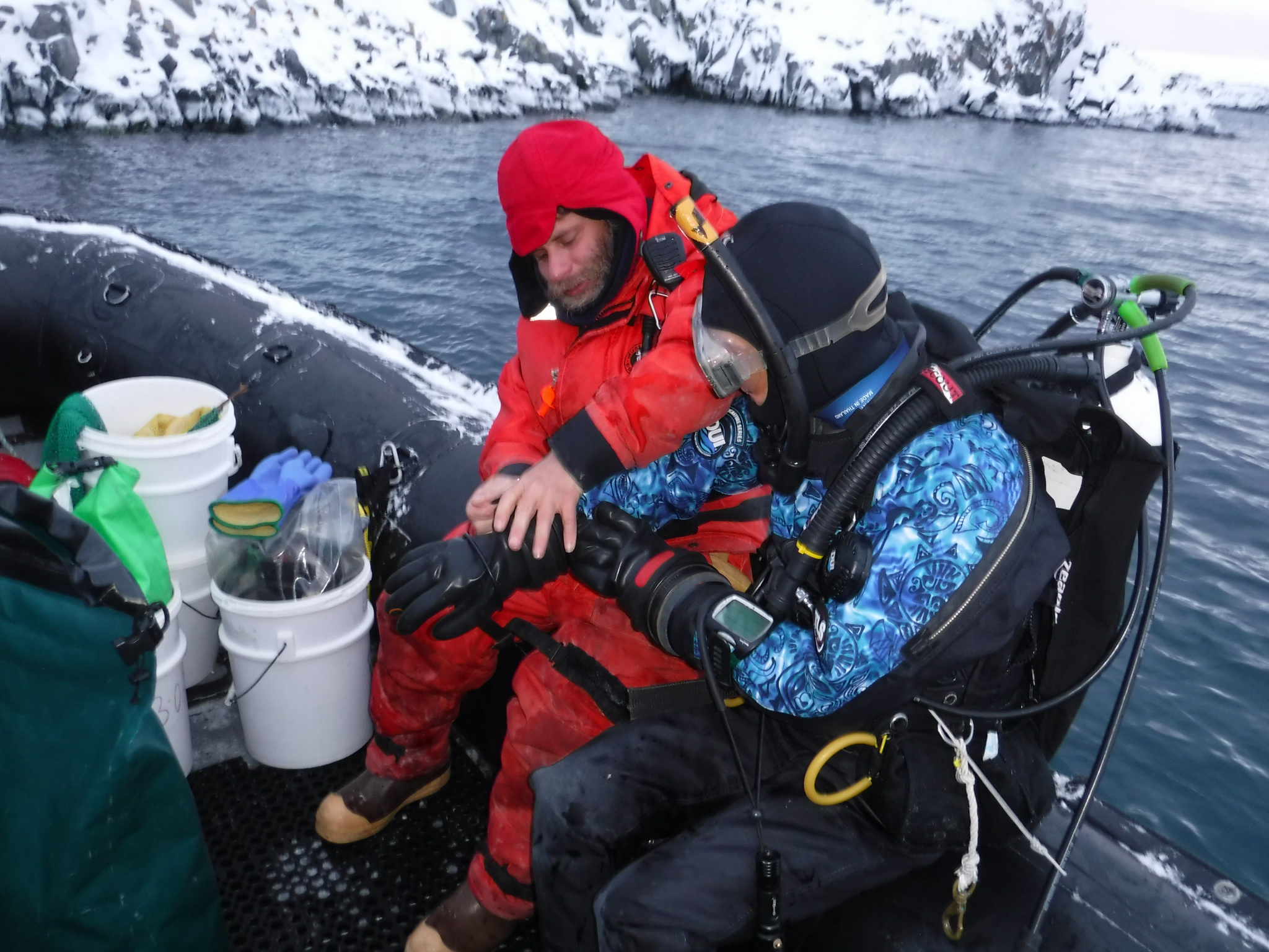 Maggie is suited up in her dive gear and ready to dive at the boating area in Palmer Station, Antarctica. Keith Smith helps out with dive tending.