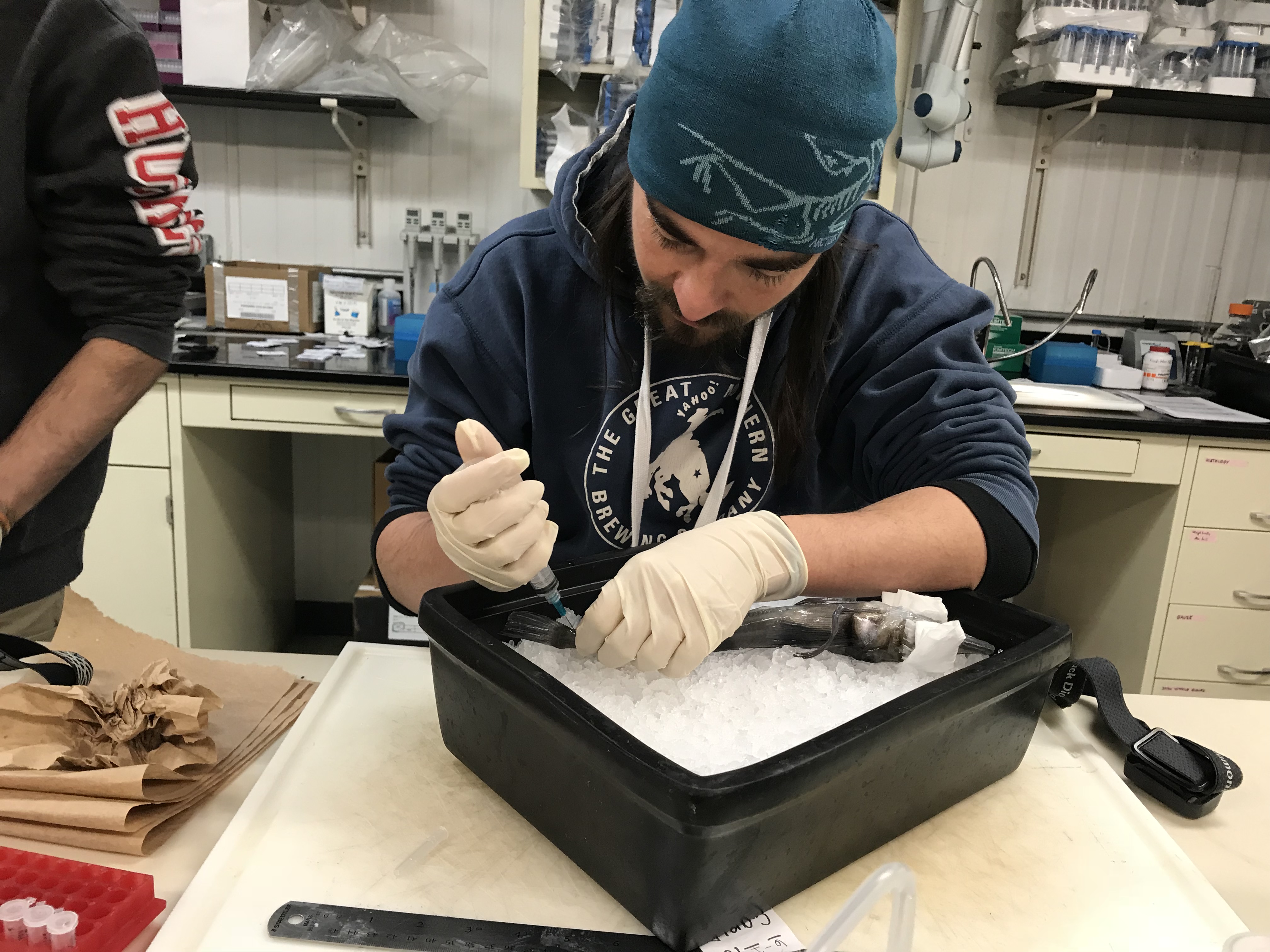 An icefish is dissected by Dr. Thomas Desvignes. It was the largest specimen of this particular species of icefish that Dr. Thomas Desvignes had seen. Eight parts of the fish are harvested for further research. Palmer Station, Antarctica.