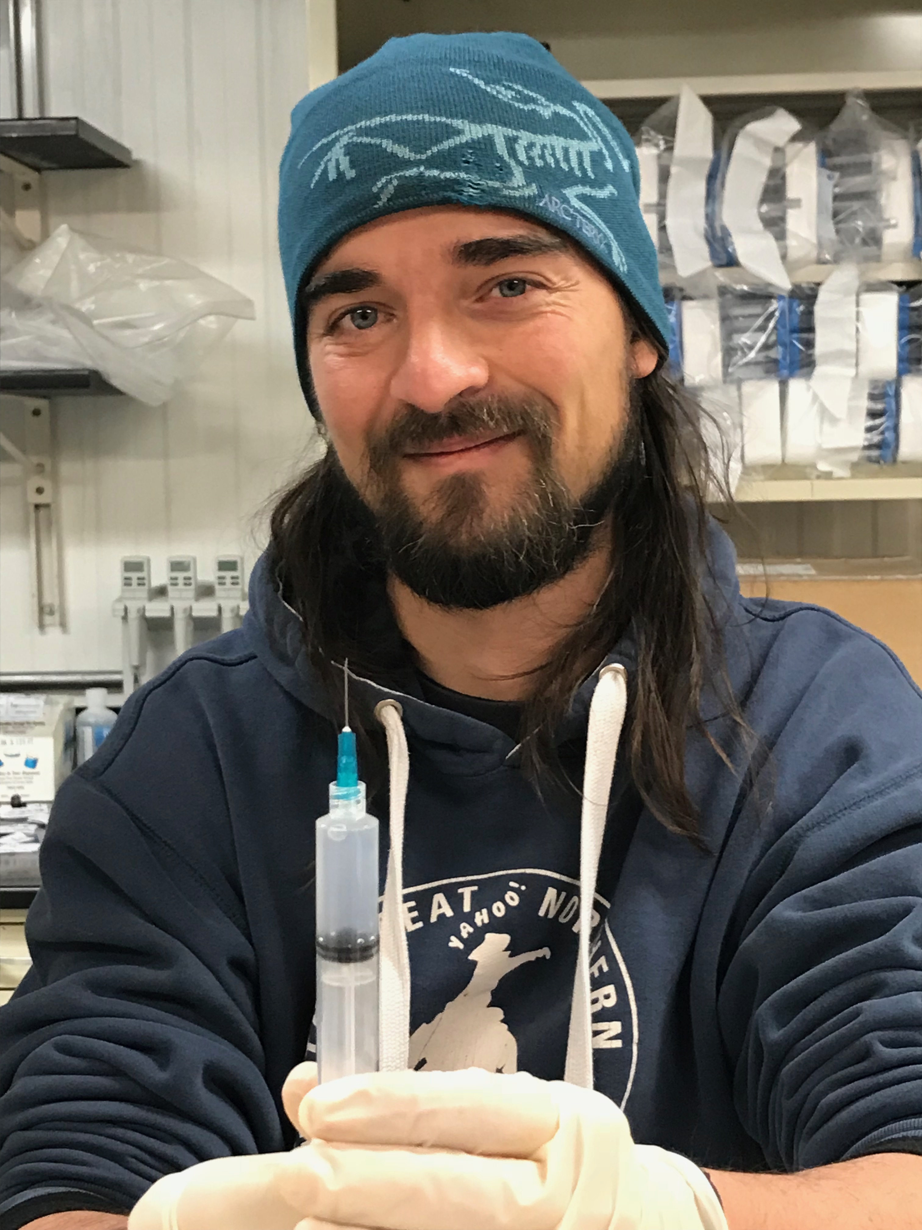 Dr. Thomas Desvignes is ready to dissect an icefish. Palmer Station, Antarctica.