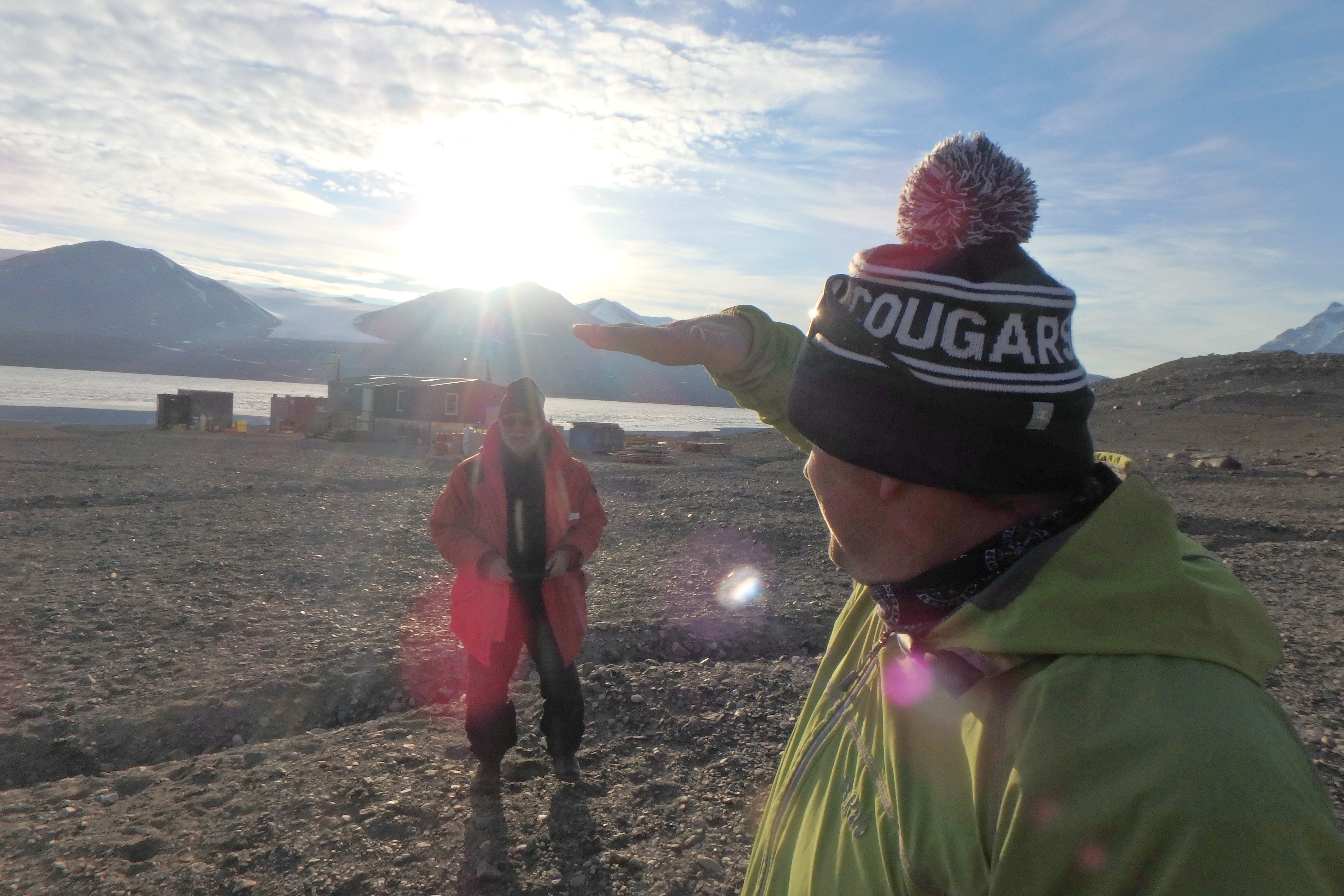 Dr. Thomas Powers and Dr. Byron Adams at Lake Fryxell camp in the midnight sunshine. Lake Fryxell, Antarctica.