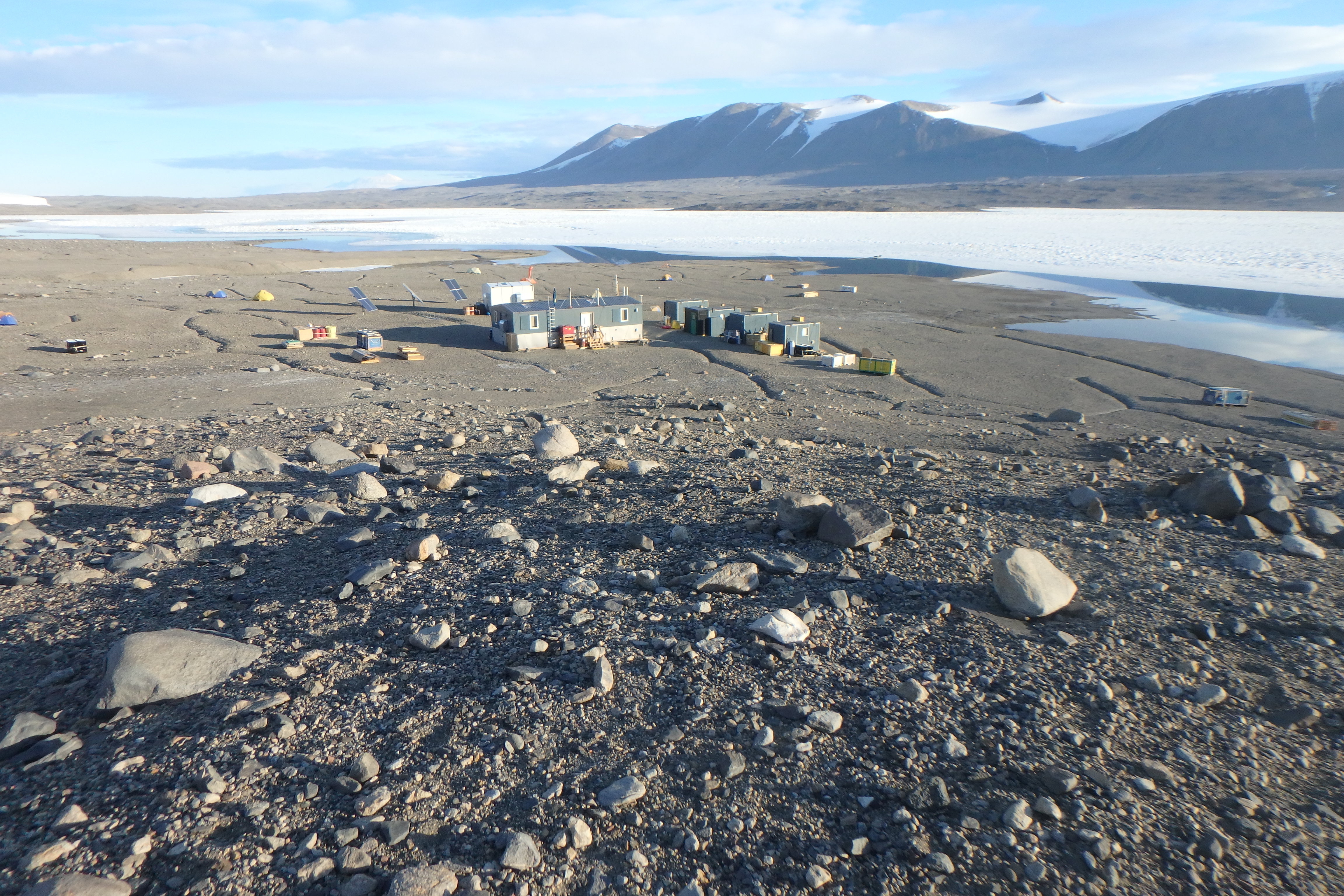 A view of the Lake Fryxell Camp from a nearby hillside. Lake Fryxell, Antarctica.