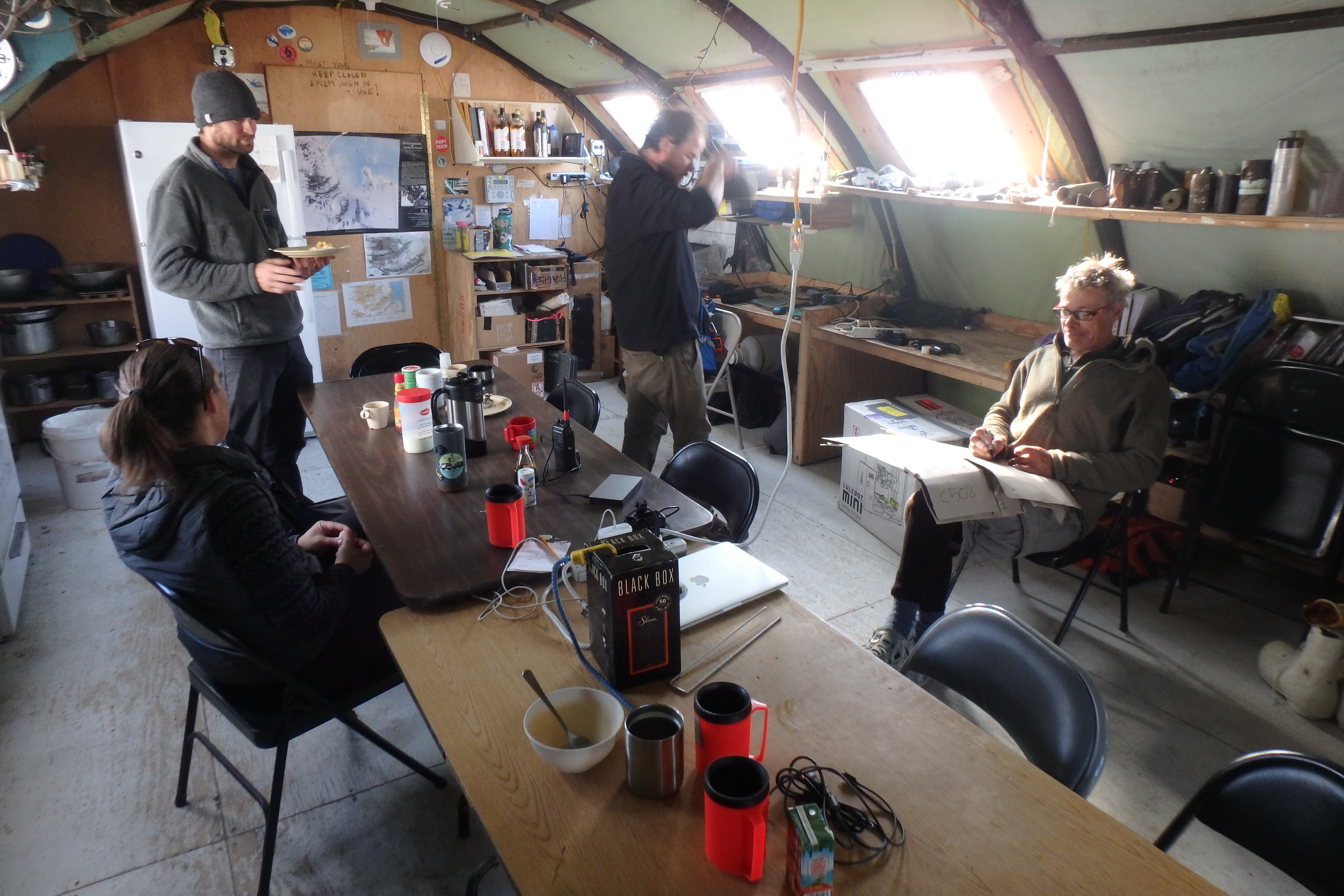 The dive team at Lake Bonney starts each morning with a meeting where goals and safety items are discussed. Lake Bonney, Antarctica.