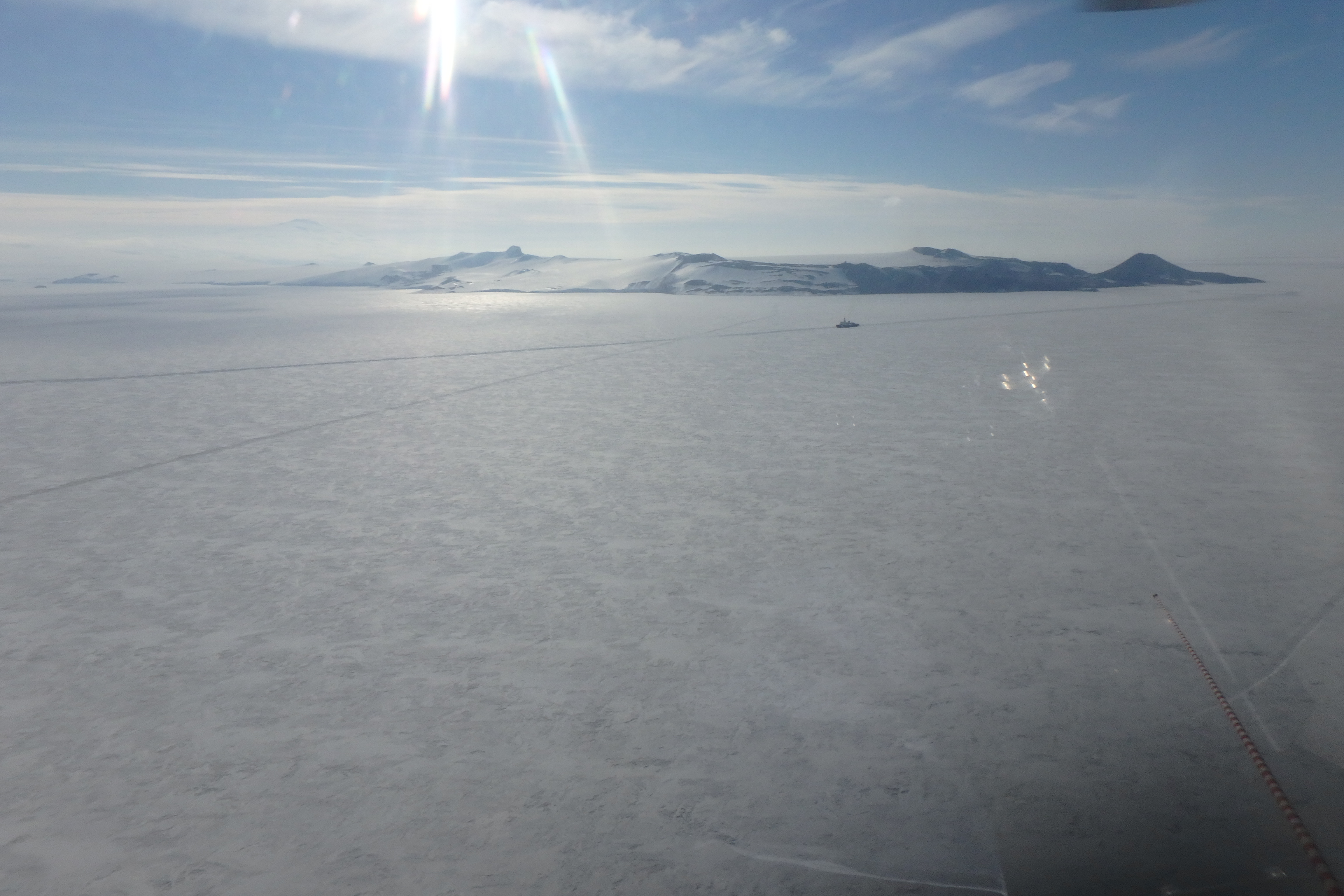 The team flies in an A-Star helicopter towards Ross Island with the Ross Ice Shelf below. In the distance the USCGC Polar Star icebreaker heads towards McMurdo Station. Ross Sea, Antarctica.