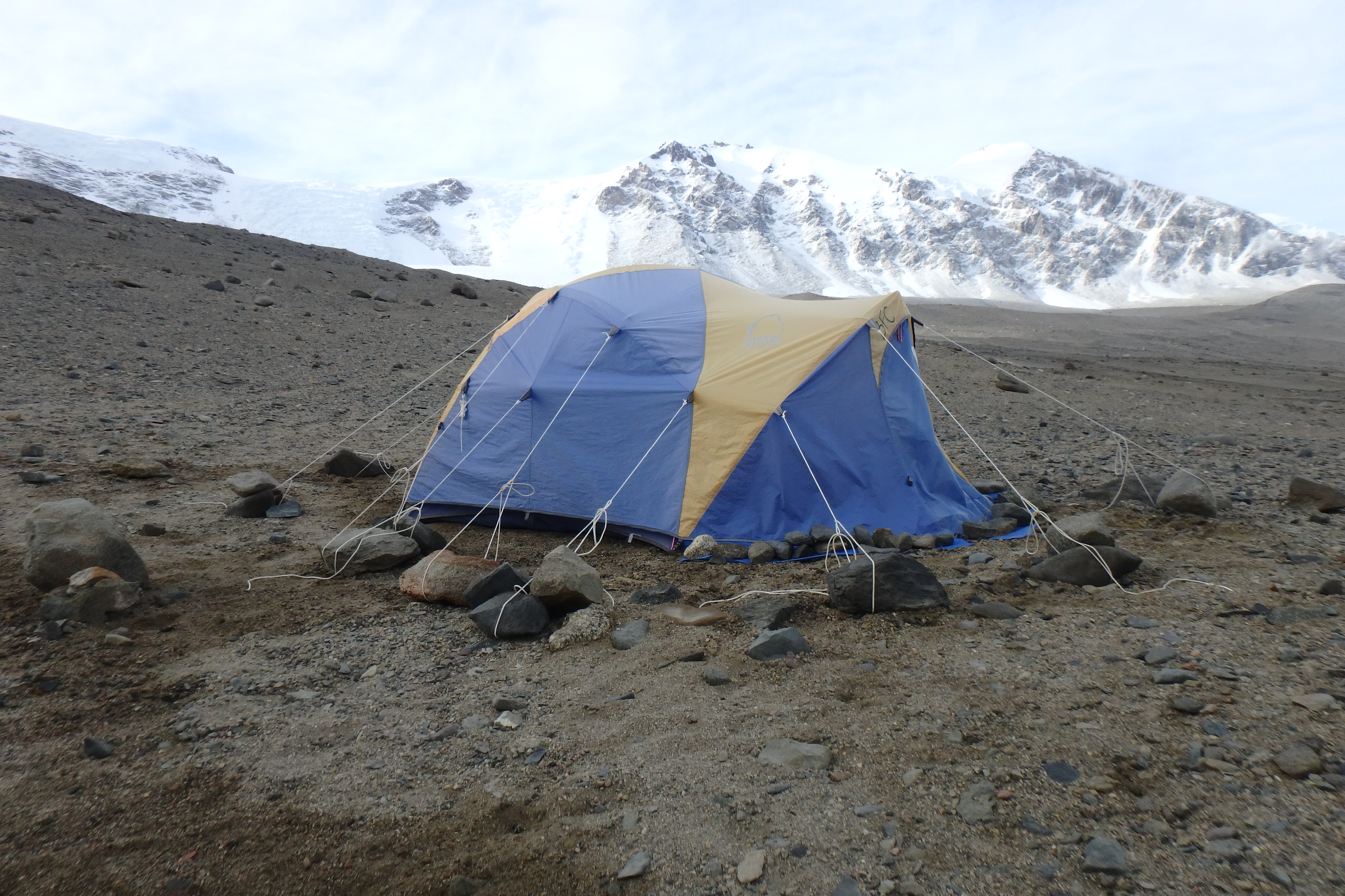 Boulders around Kevin Dickerson's tent keep it anchored down in strong winds. Lake Bonney, Antarctica.