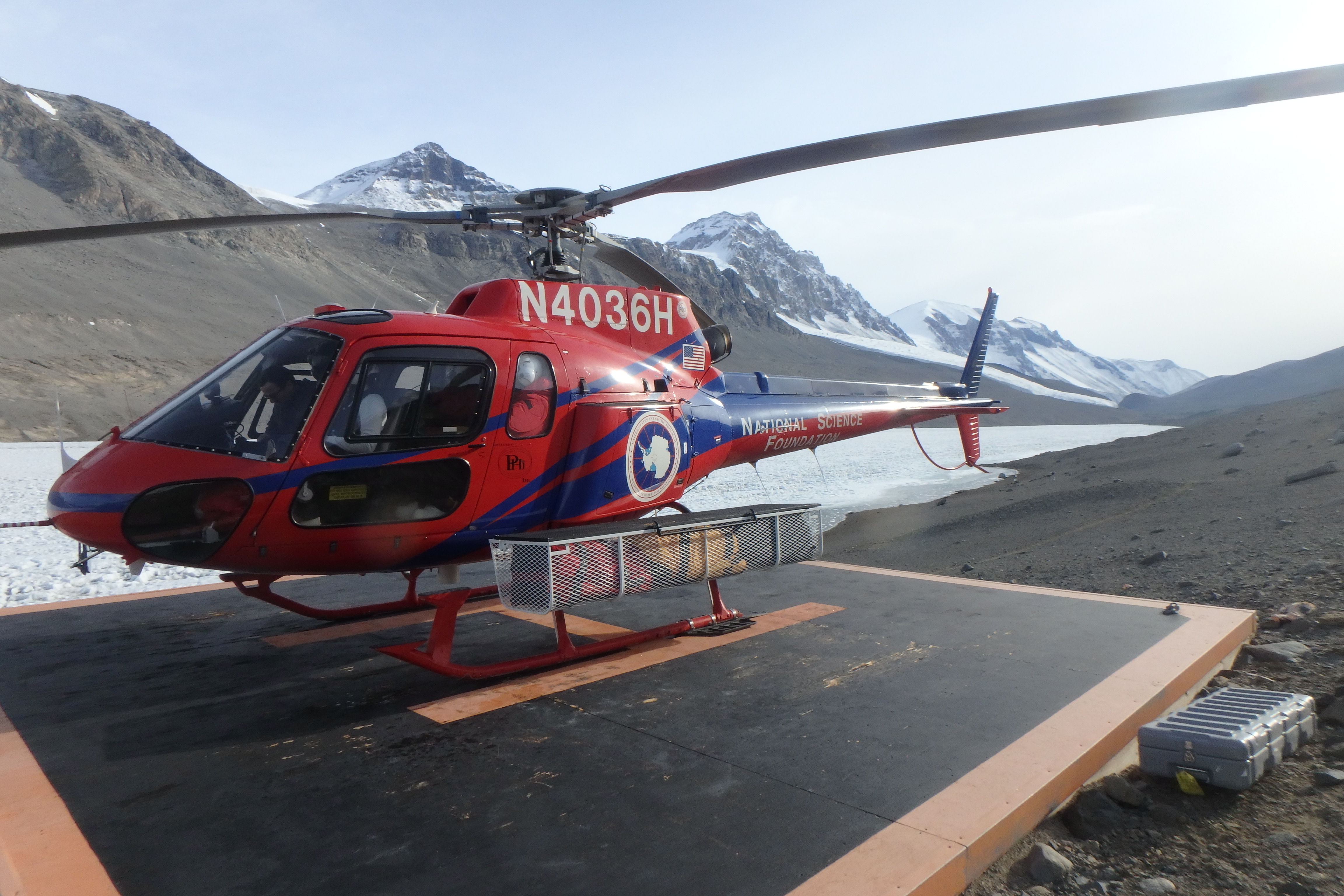 This A-Star helicopter is one of the two helicopters used to shuttle scientists, and their equipment, out to the camps and remote field locations where their research is being conducted. Lake Bonney, Antarctica.