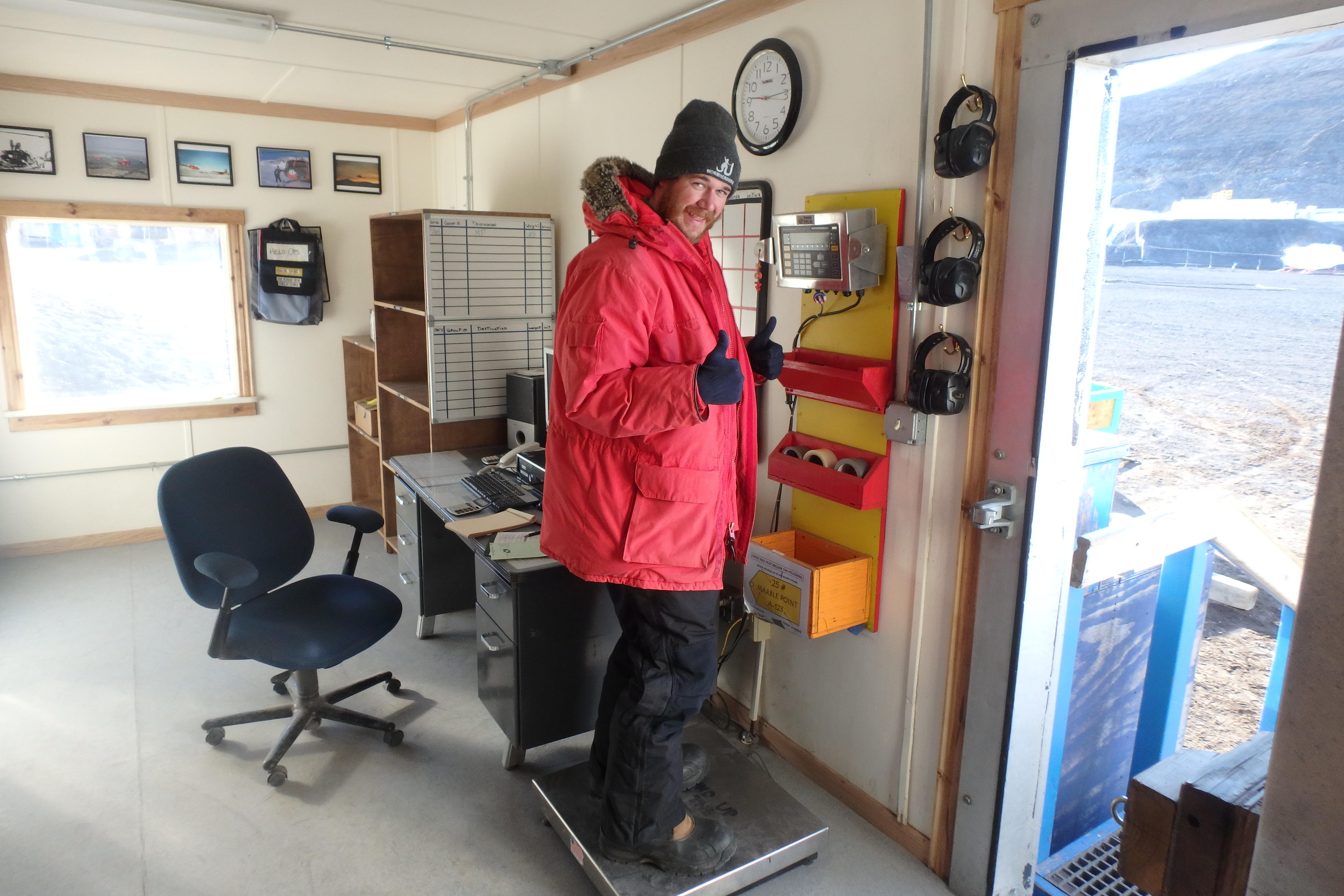 Matt Hedin, a member of the "Wormherders" soil team, weighs in prior to departure aboard a helicopter. Passengers and cargo are carefully weighed to be sure the carrying capacity of the helicopter is not put at an unsafe level. McMurdo Station, Antarctica.