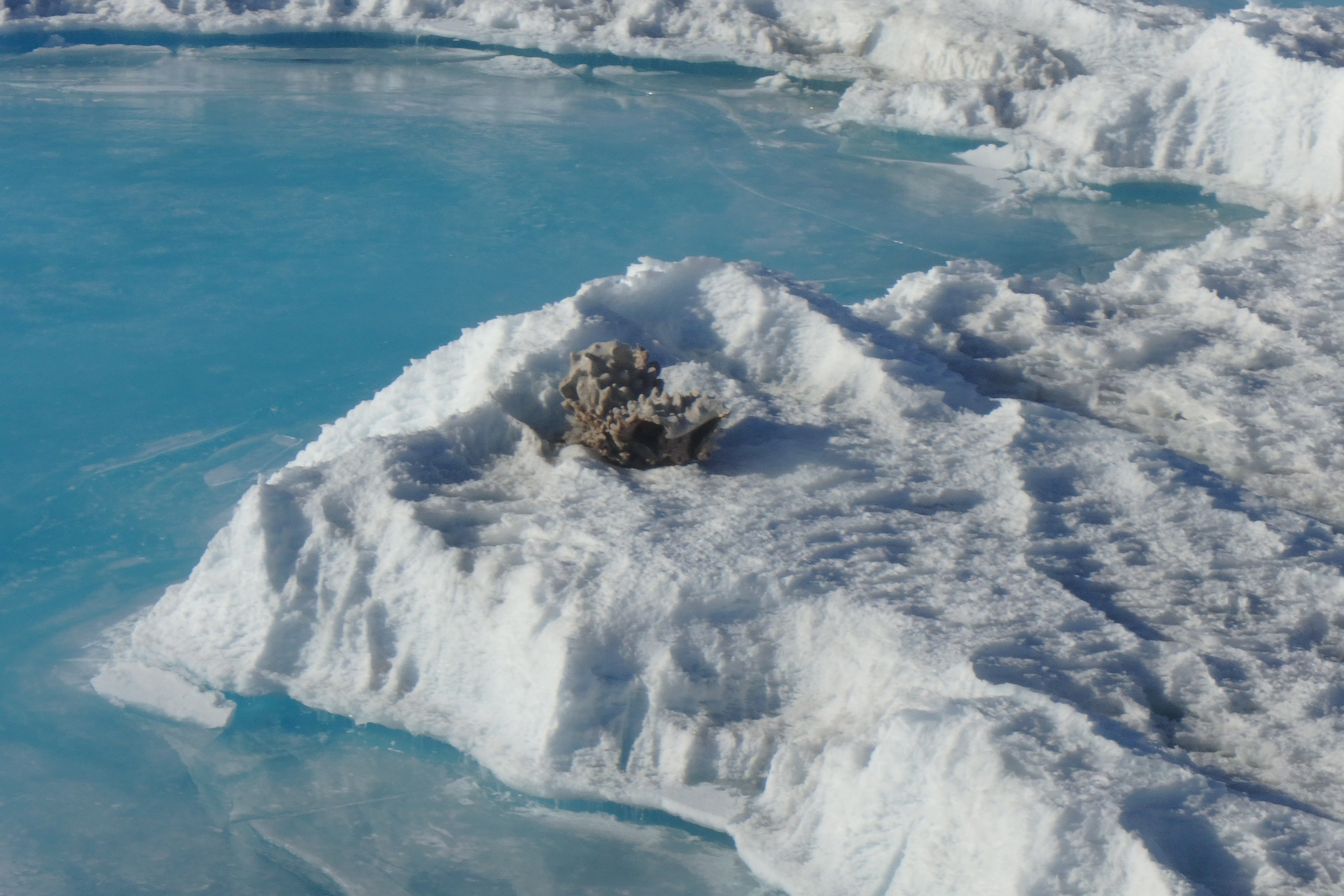 Kevin Dickerson: "A very large sponge on top of the Ross Ice Shelf. This is a very old animal which has become dislodged from the sea floor and floated up to the ice shelf. Over many years, it melted through the ice and ended up on top where we spotted it as we were flying towards Garwood Valley." Above the Ross Ice Shelf approaching Garwood Valley, Antarctica.