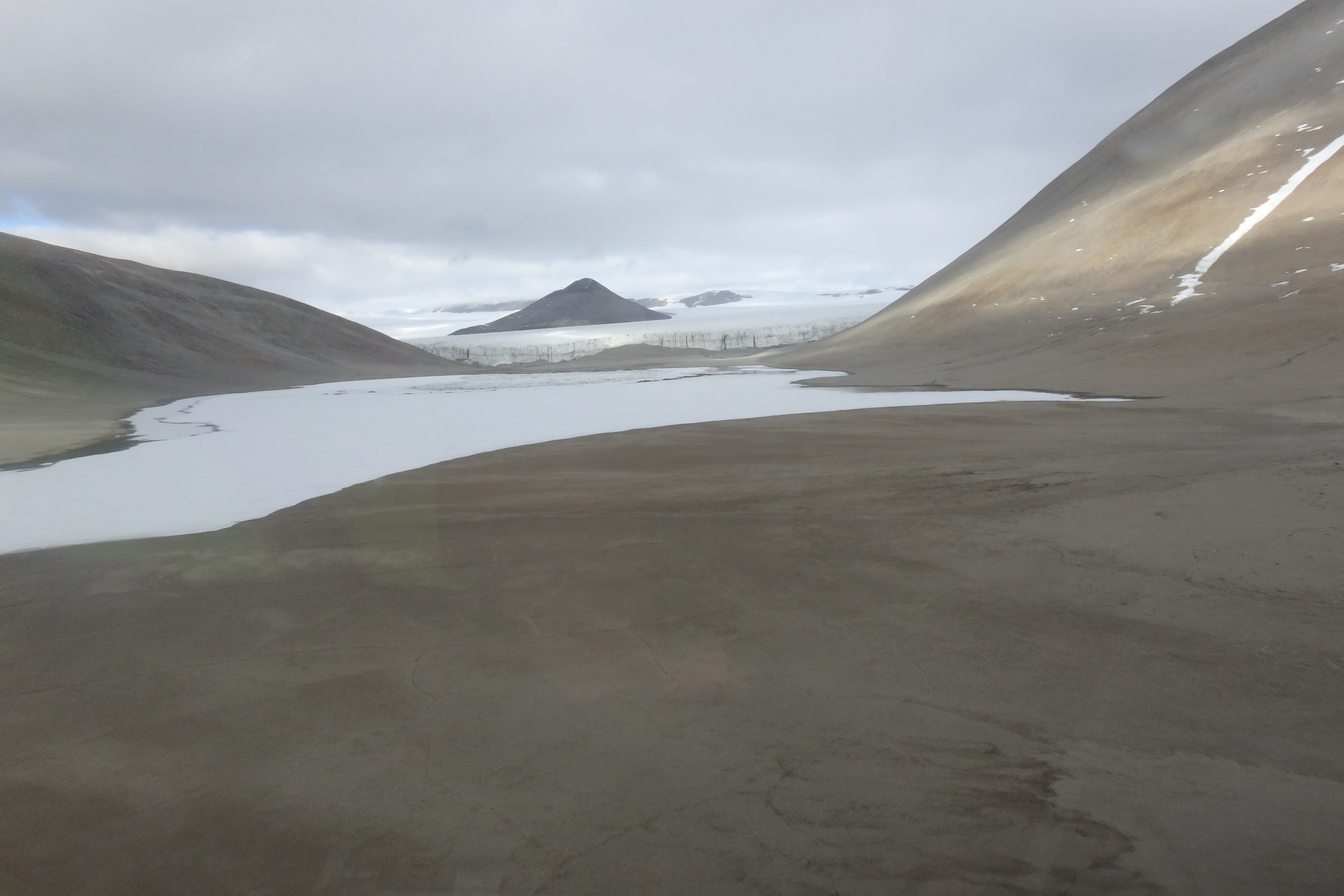 A view from a helicopter of the collection site in Garwood Valley, Antarctica. There are soil experiments going on in this area including data monitors that send out live data year-round. Garwood Valley, Antarctica.