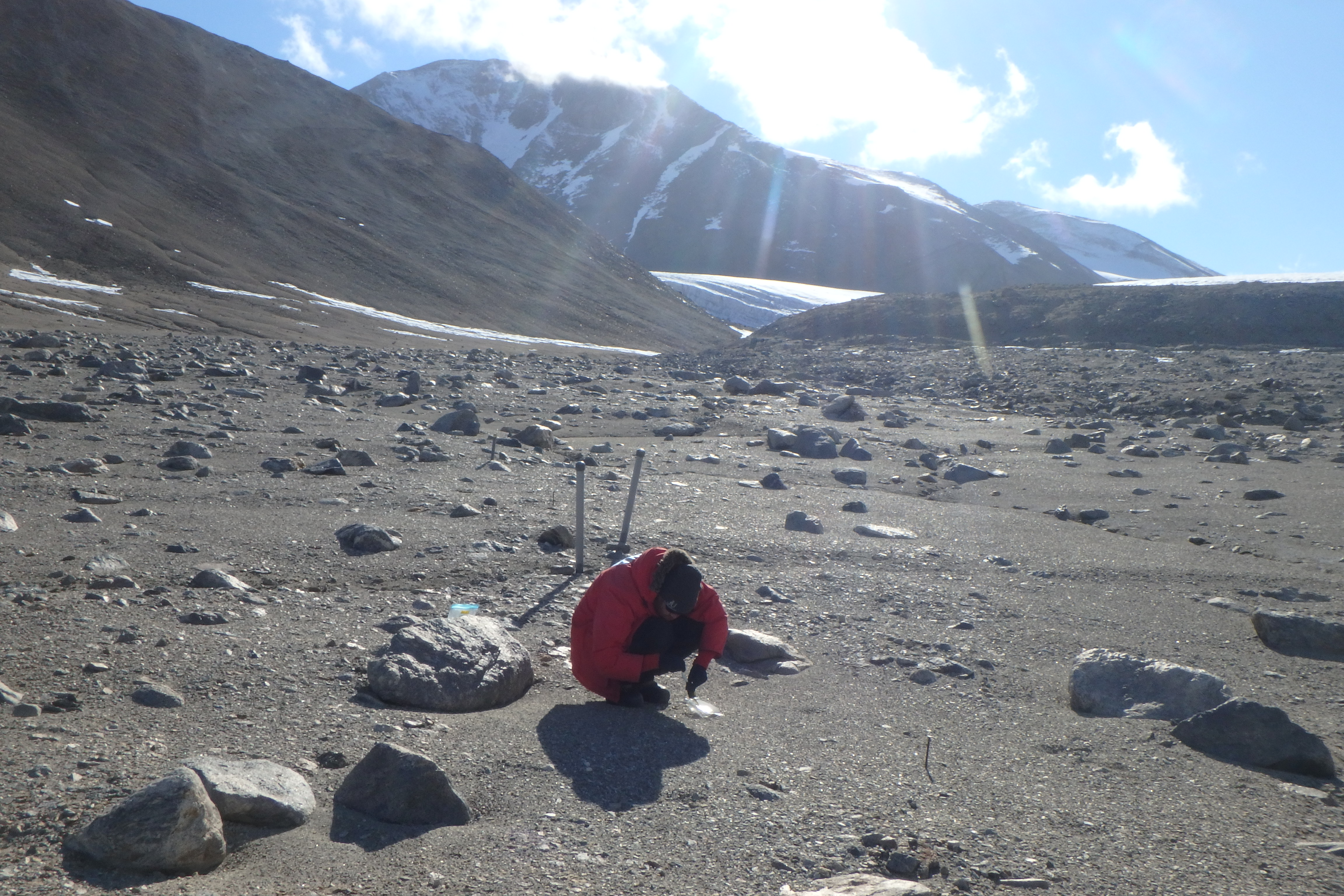 Matt Hedin collects soil samples in Garwood Valley. Kevin Dickerson: "Notice that he is standing on a rock, and there are no other footprints around him. Our team was very careful not to disturb the ecosystem any more than necessary. Also in this photo, you can see the spike in the soil to the right of Matt. This tells us year after year, where samples are to be taken." Garwood Valley, Antarctica.