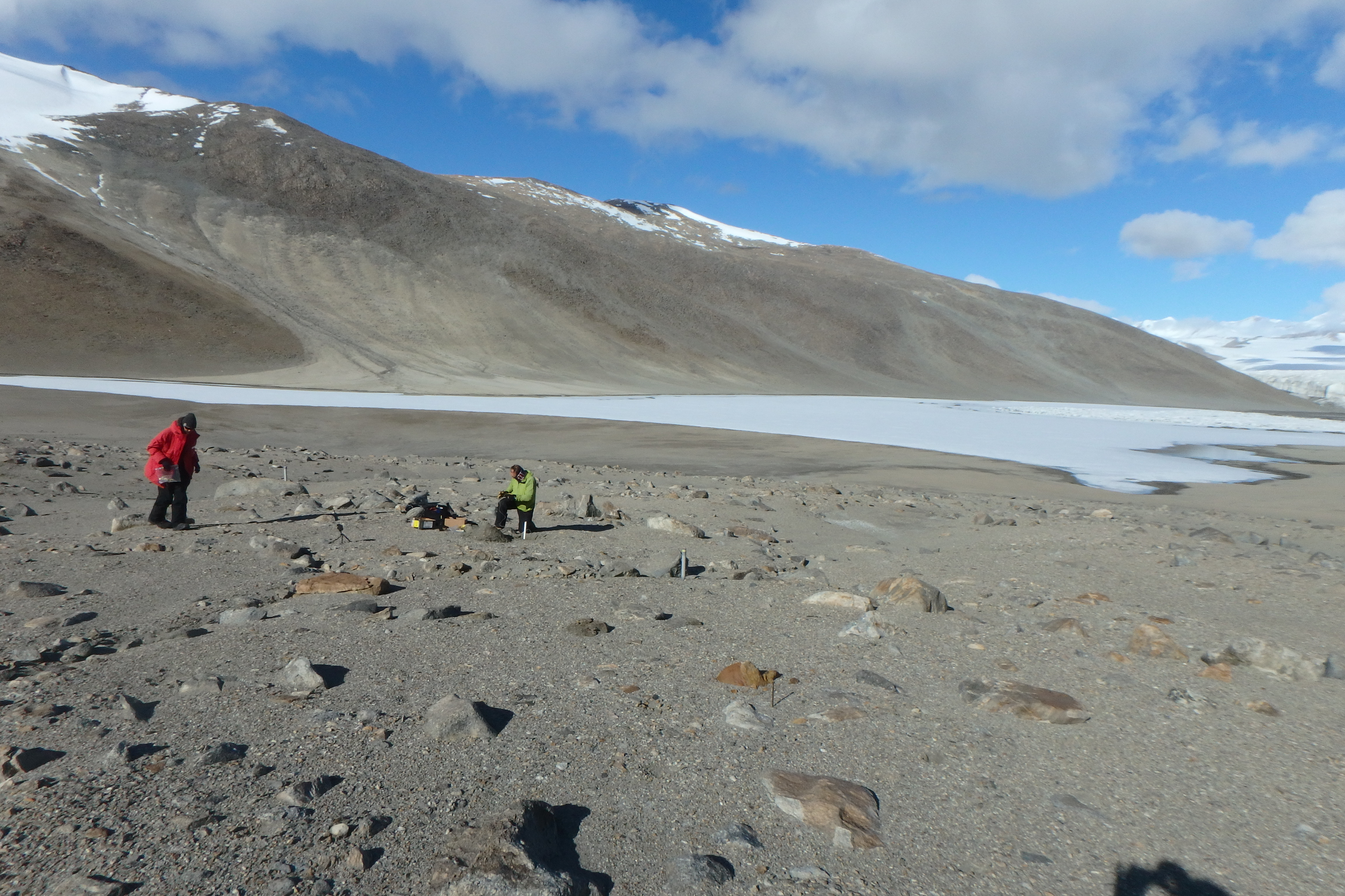 Matt Hedin (left) collects soil samples as Dr. Byron Adams installs a year-round, real-time weather data collection monitor. Garwood Valley, Antarctica.