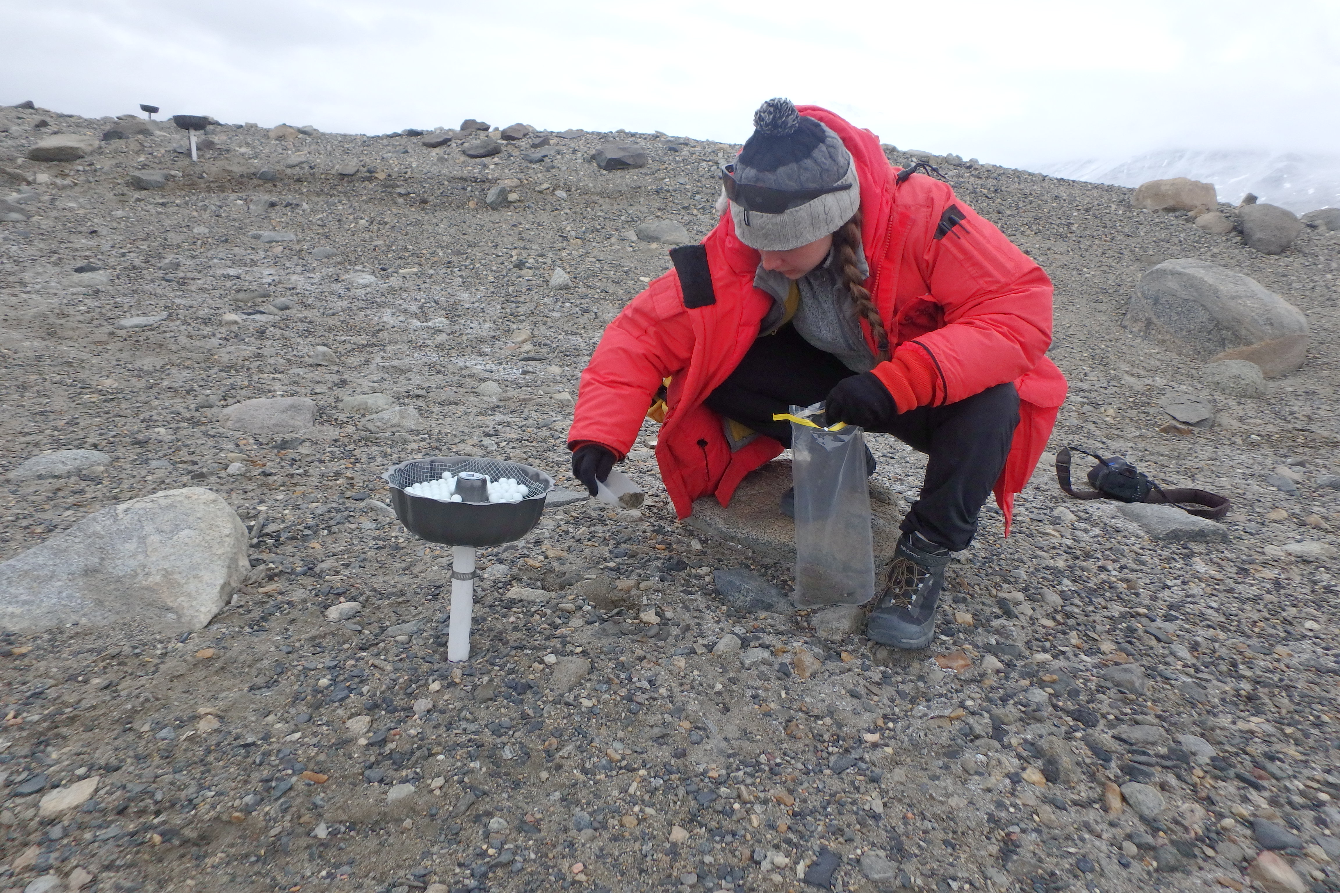 Natasha Griffin collects soil samples near the aeolian experiment. Aeolian means "wind deposited". The device in front of Natasha is a bundt pan with marbles in it. Dust from the wind gets trapped inside. Dust samples are then collected and checked for wind deposited microbial animals. Note the additional collecting pans in the background. F6 Camp, McMurdo Dry Valleys, Antarctica.
