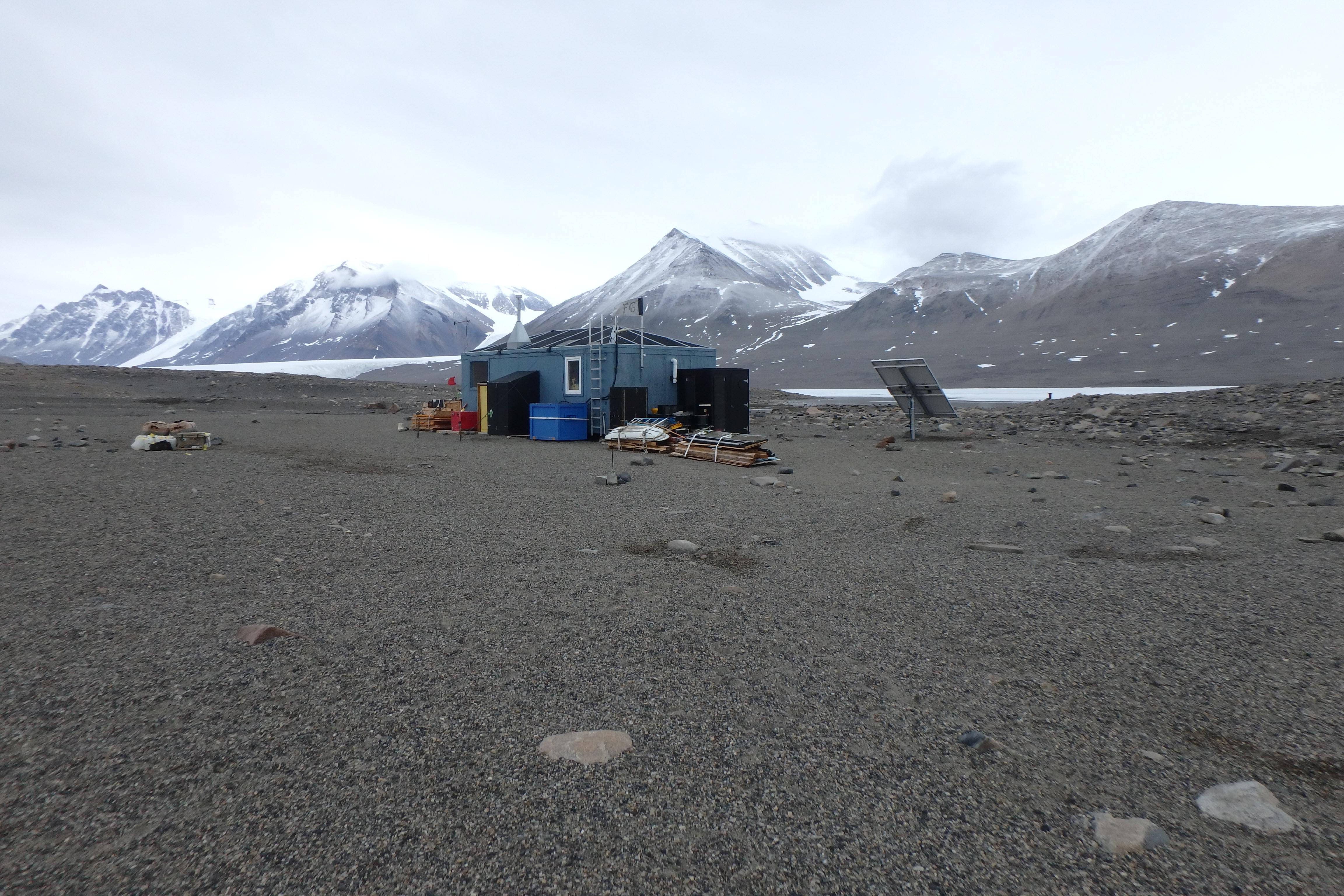 A view of the F6 Camp. This research camp is equiped with a solar panel, as are many camps in the McMurdo Dry Valleys. The Canada Glacier is in the background. F6 Camp, McMurdo Dry Valleys, Antarctica.