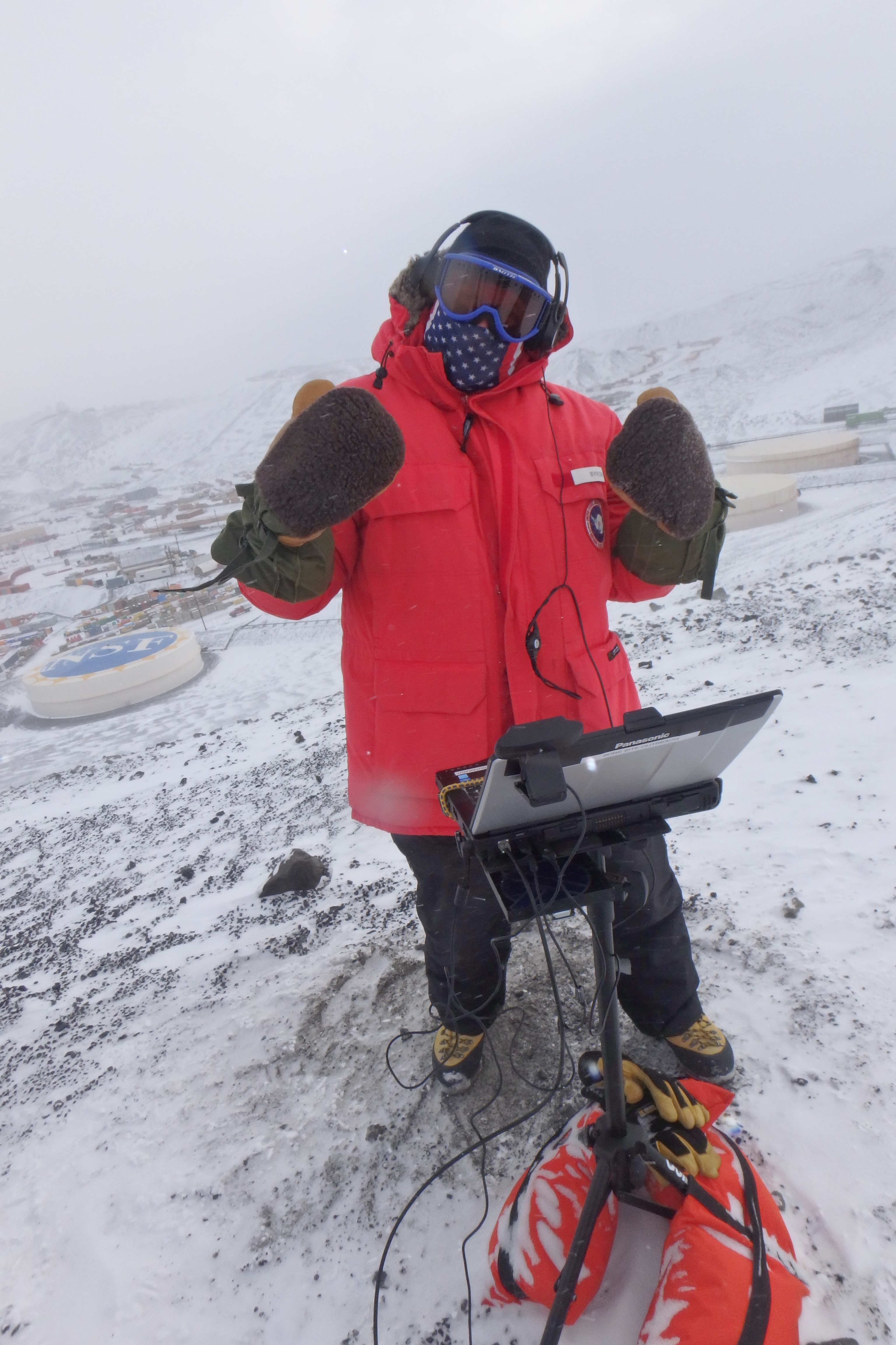 Even in the extremely harsh Antarctic conditions, Dr. Byron Adams still held Skype calls to students back in the United States. Observation Hill at McMurdo Station, Antarctica.