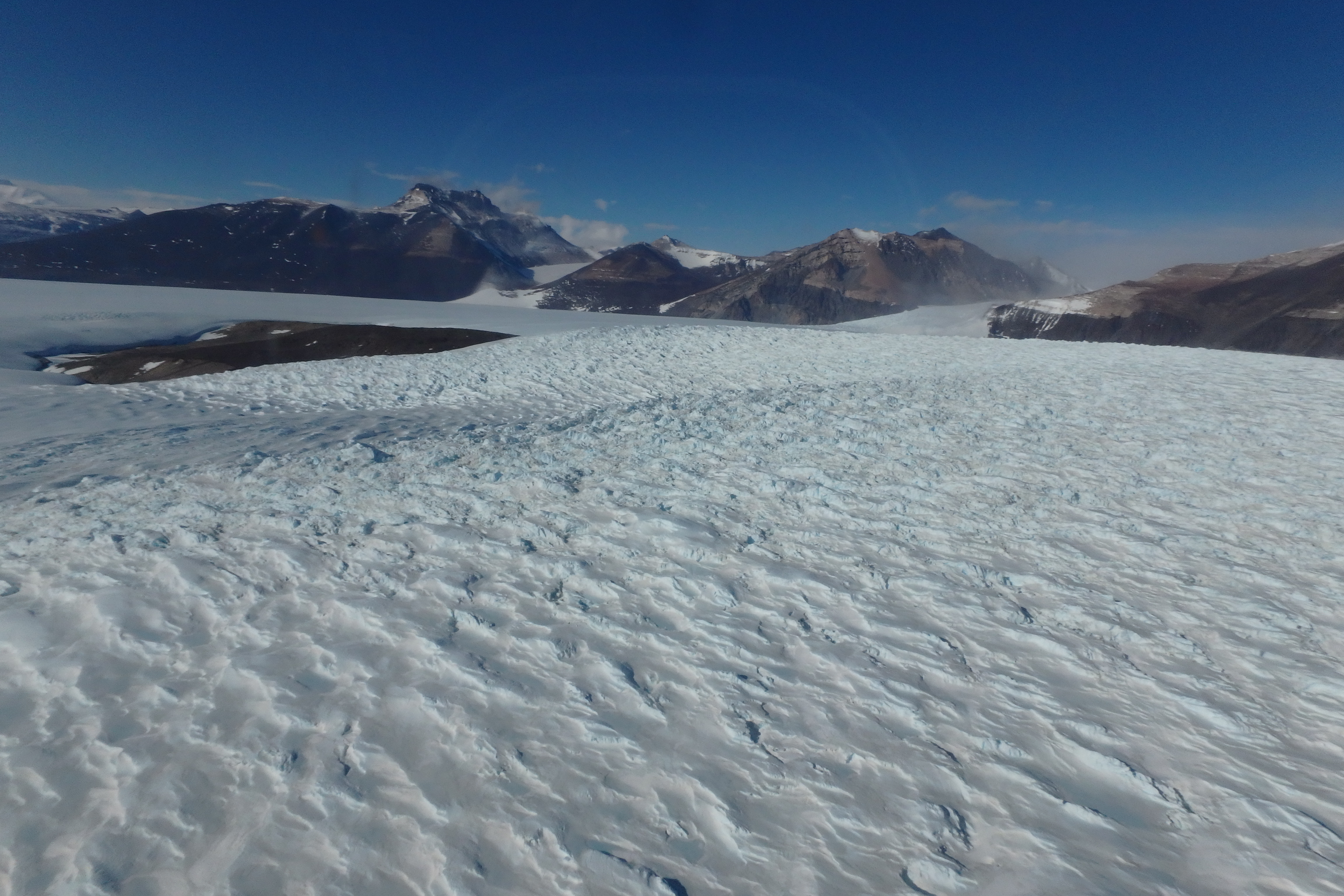 The team flies in a helicopter over the upper portion of Taylor Glacier headed for University Valley, Antarctica.