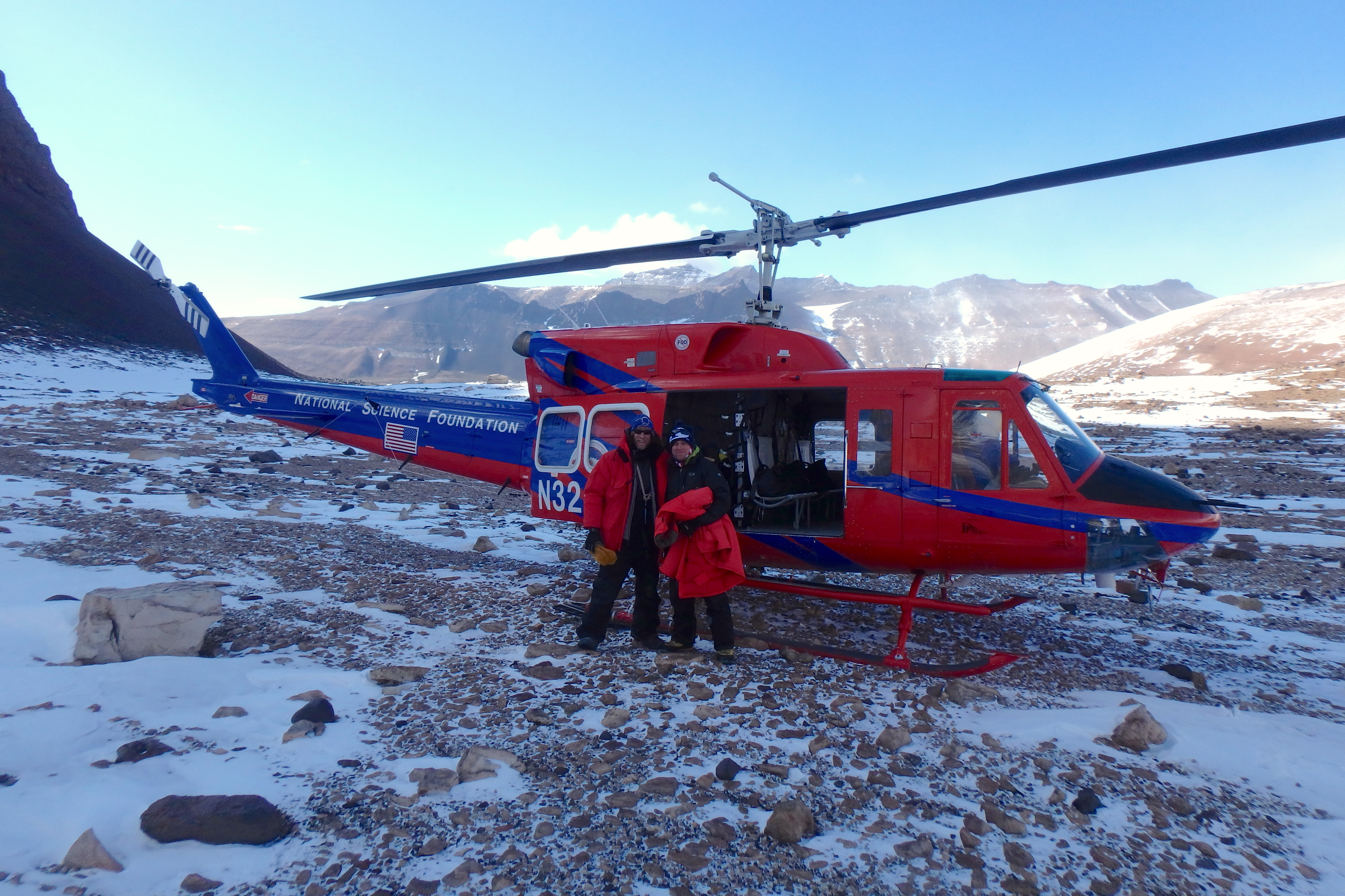 Kevin Dickerson and Dr. Byron Adams load into a Bell 212 helicopter to depart University Valley, Antarctica.