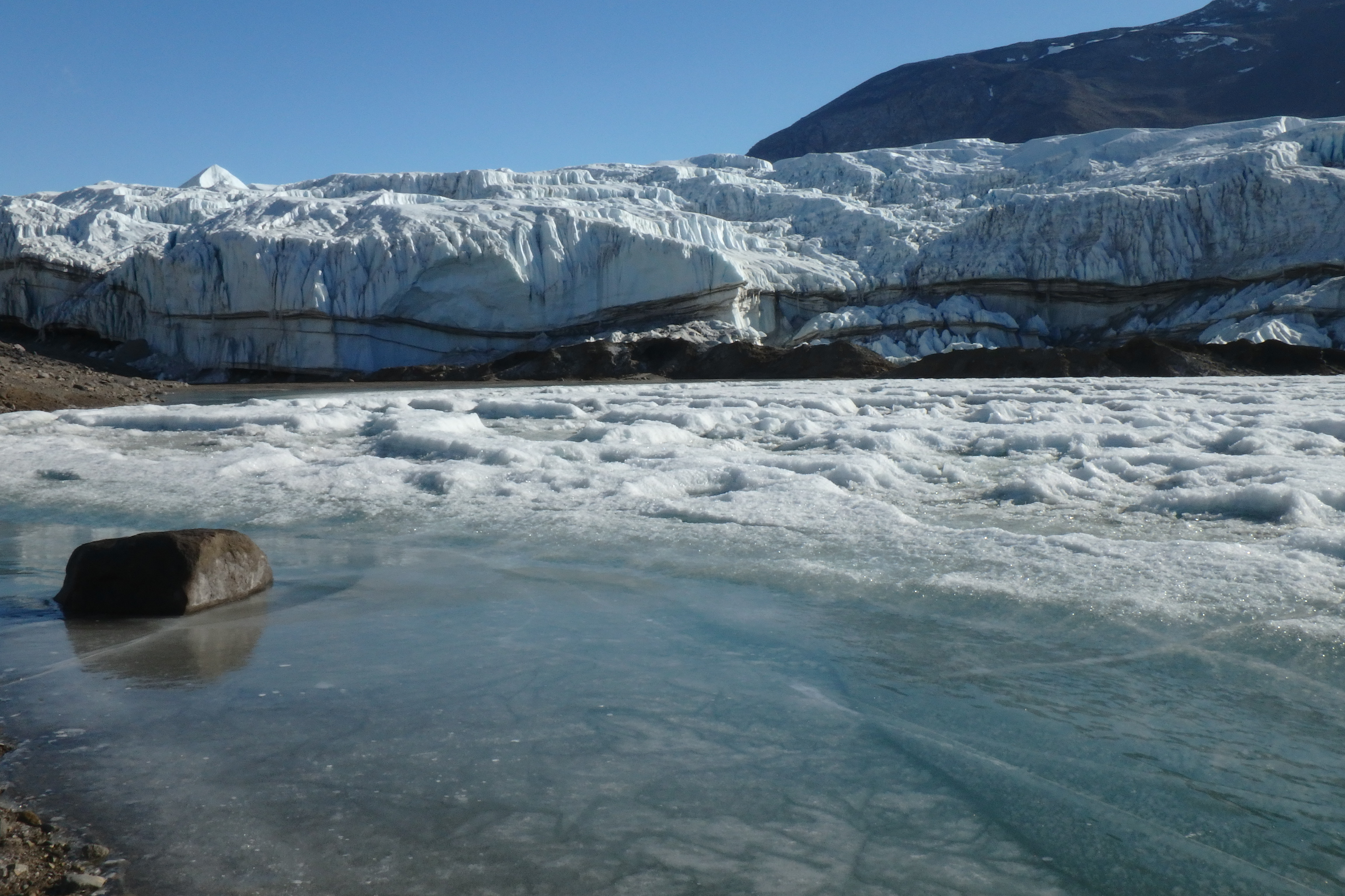 In the foreground you can see a "moat" (thin ice around the lake edge) and the thick ice of Lake Bonney. In the background is the terminal end of Taylor Glacier. Lake Bonney, Taylor Valley, Antarctica.