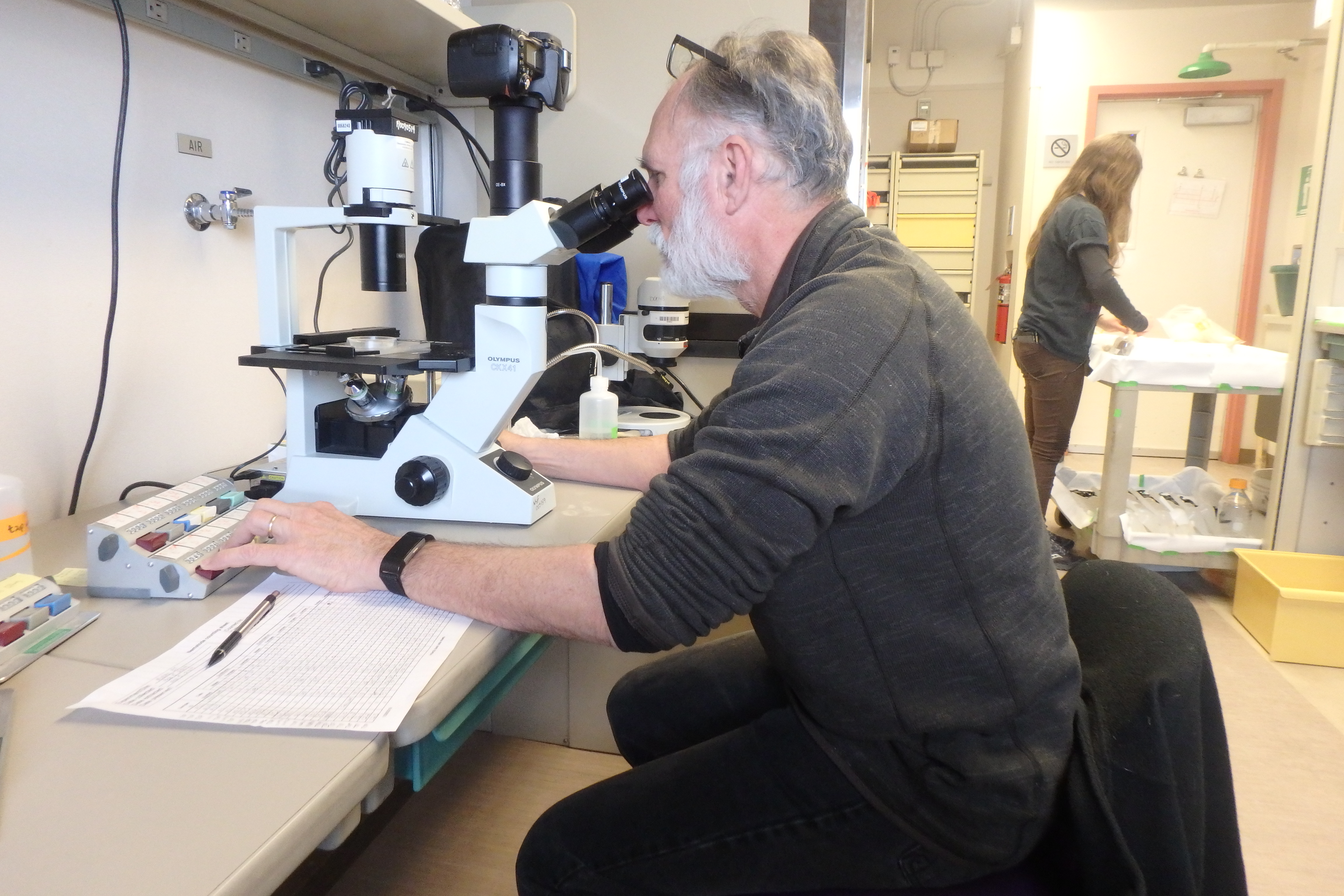 Dr. Thomas Powers counts soil animals from soil samples taken from the McMurdo Dry Valleys. He is counting the numbers of species, the sex of the animal, if it was alive or dead, and if it was an adult or juvenile. Crary Laboratory, McMurdo Station, Antarctica..