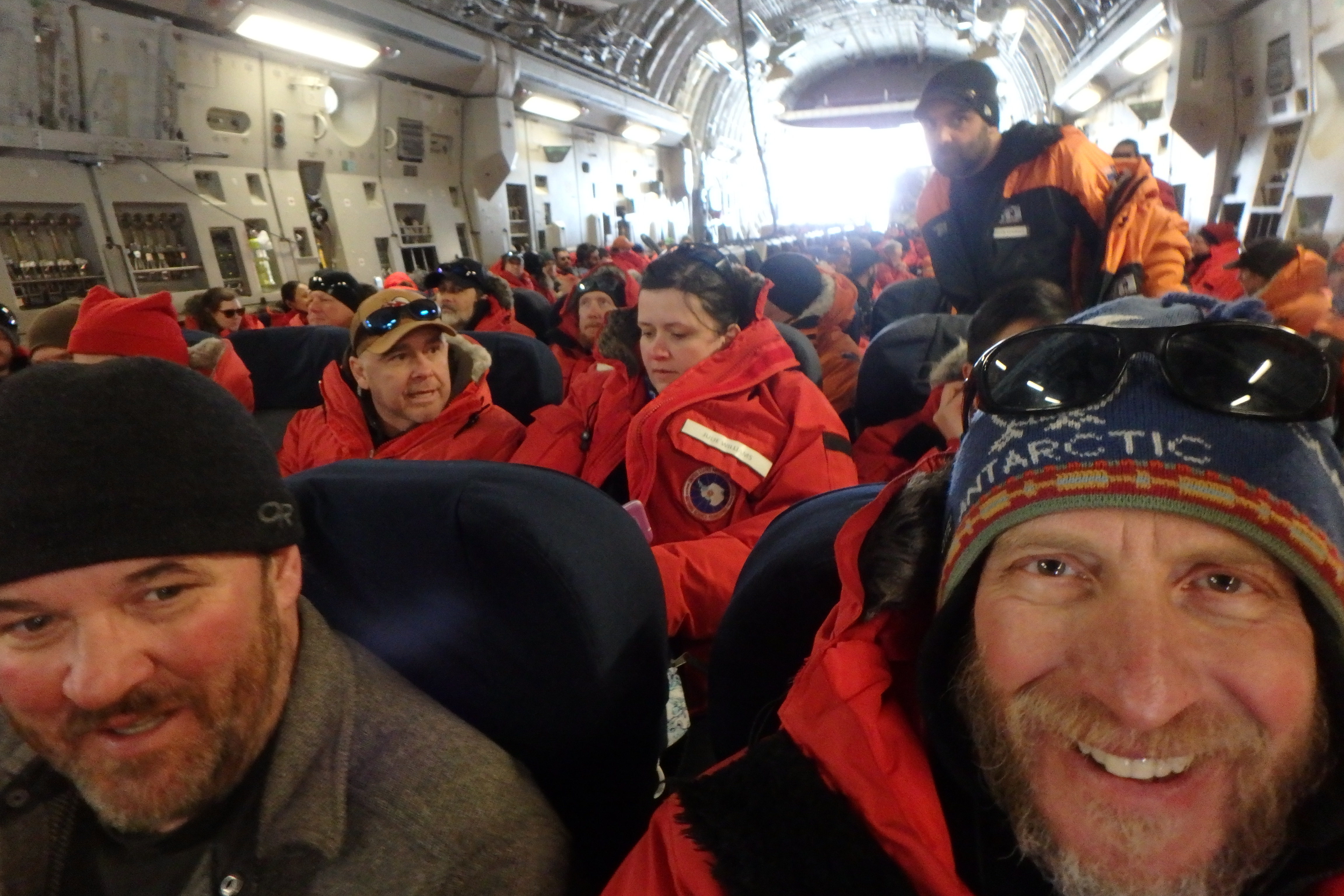 Kevin Dickerson seated in the Air Force C-17 ready to leave Antarctica for New Zealand. Phoenix Runway on the Ross Ice Shelf, Antarctica.