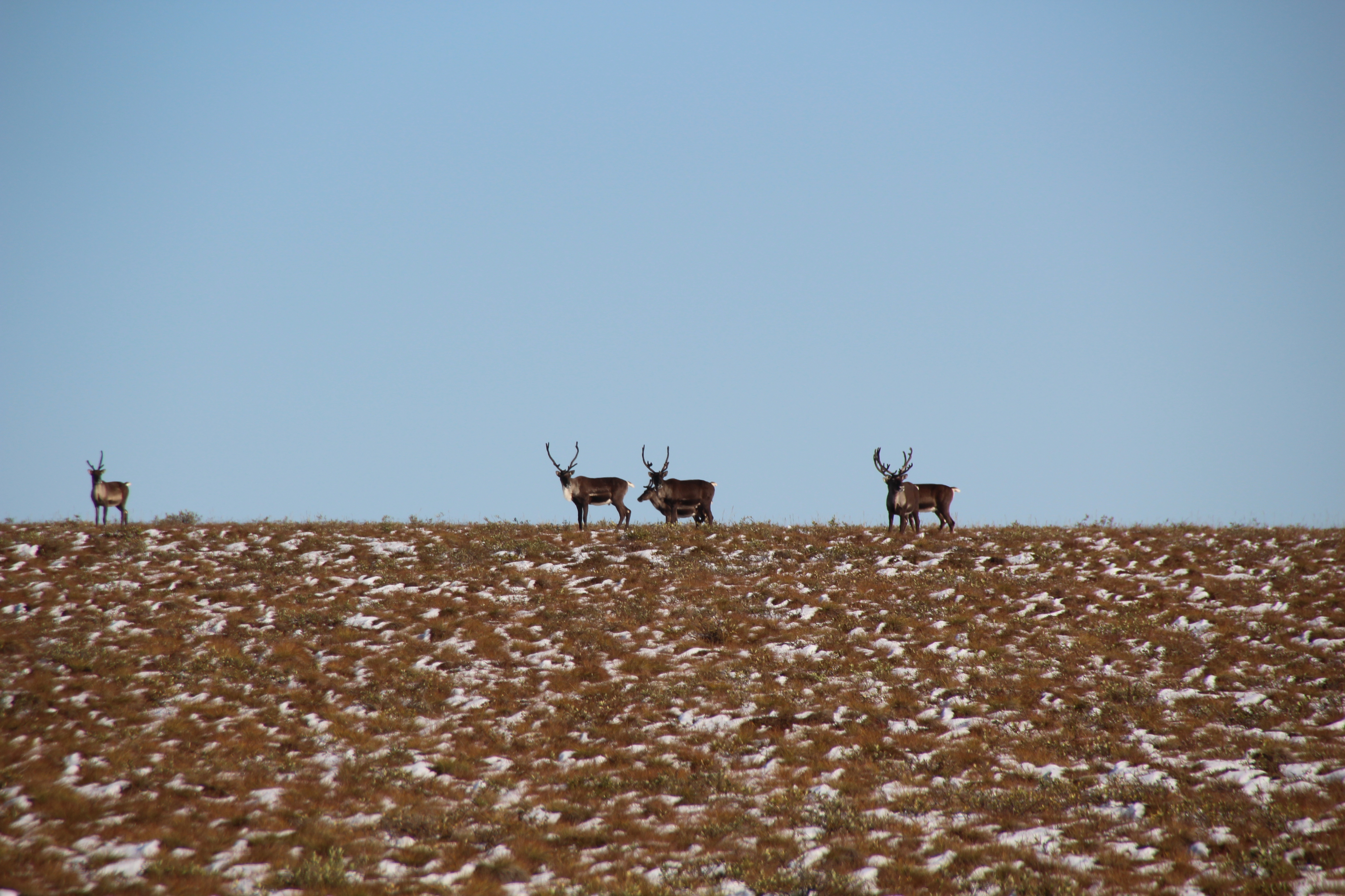 Caribou graze along the Dalton Highway on the North Slope of Alaska.