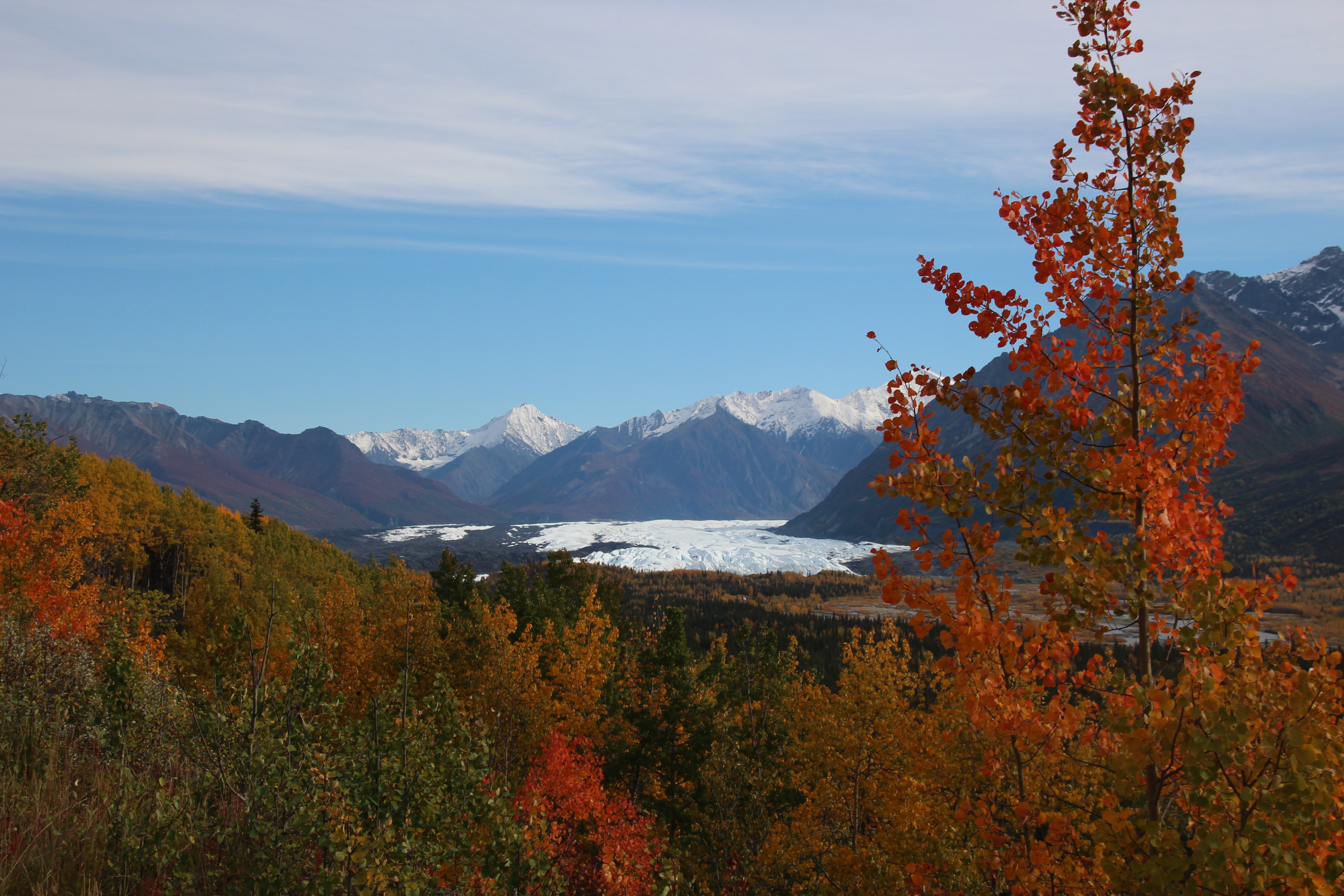 A view of the Matanuska Glacier with changing fall colors along the Glenn Highway in Alaska.