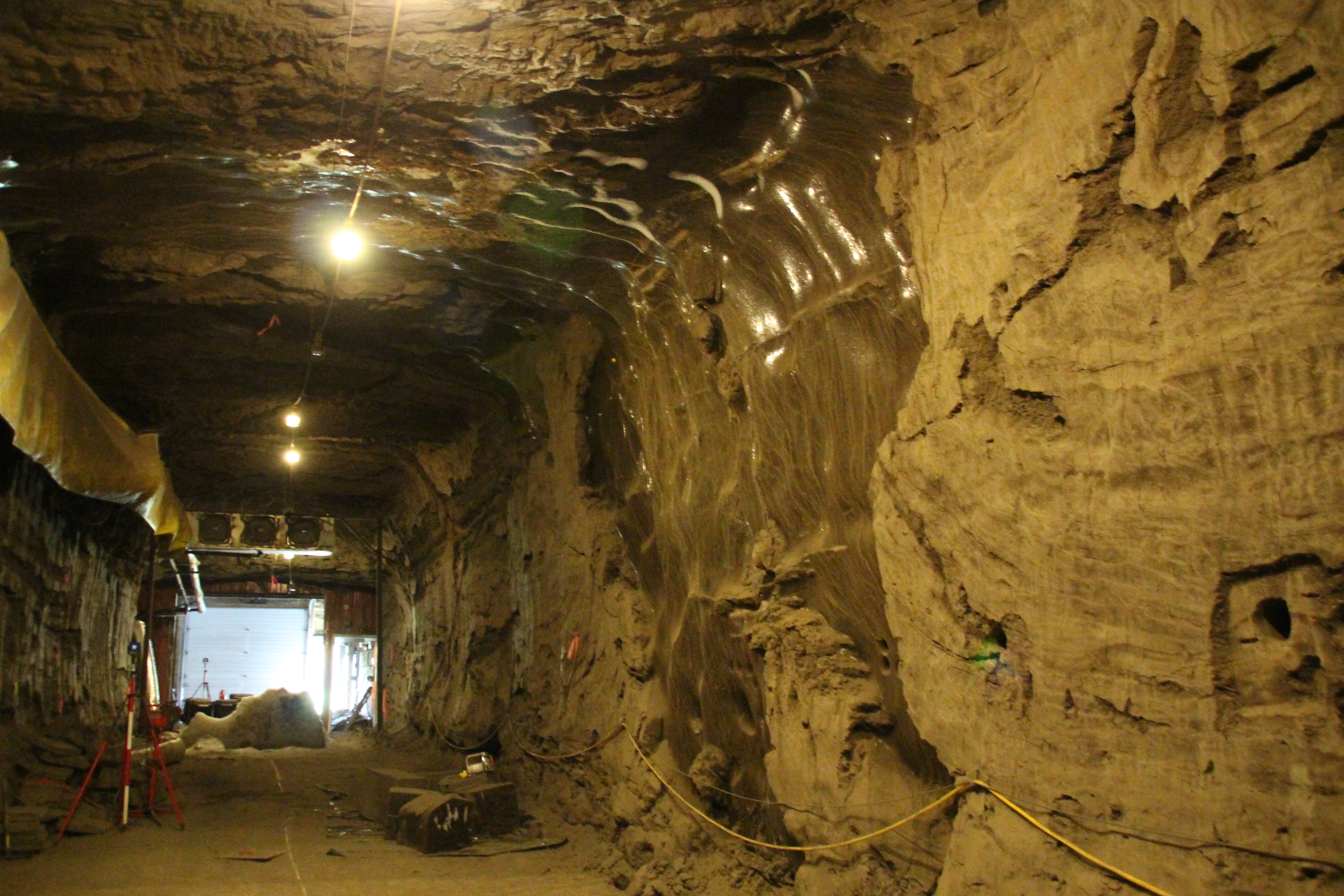 Large ice wedges in the new section of the CRREL Permafrost Research Tunnel in Fox, Alaska.
