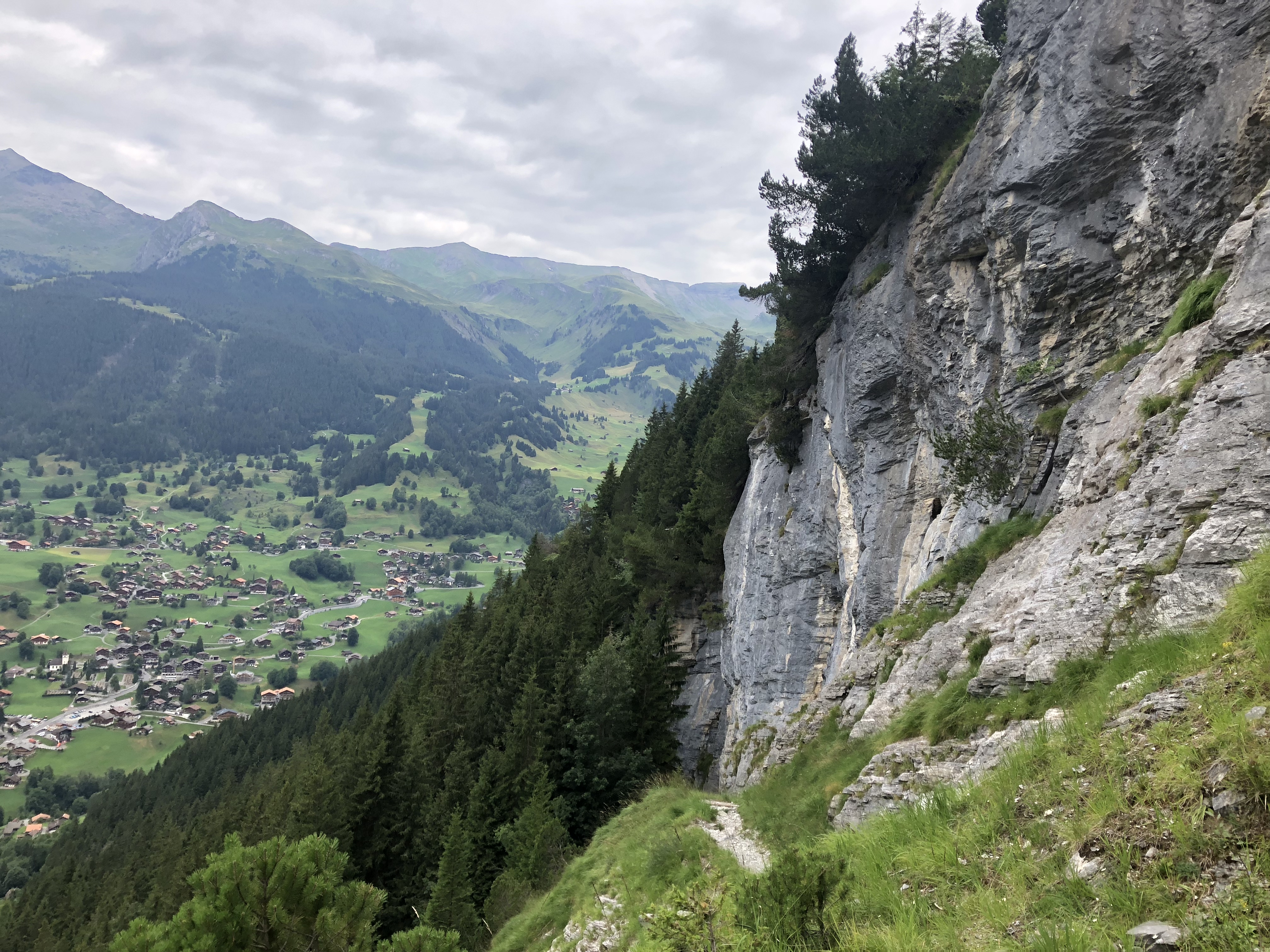 A look along the Bargg hiking path and the view down in the valley of Grindelwald, Switzerland.