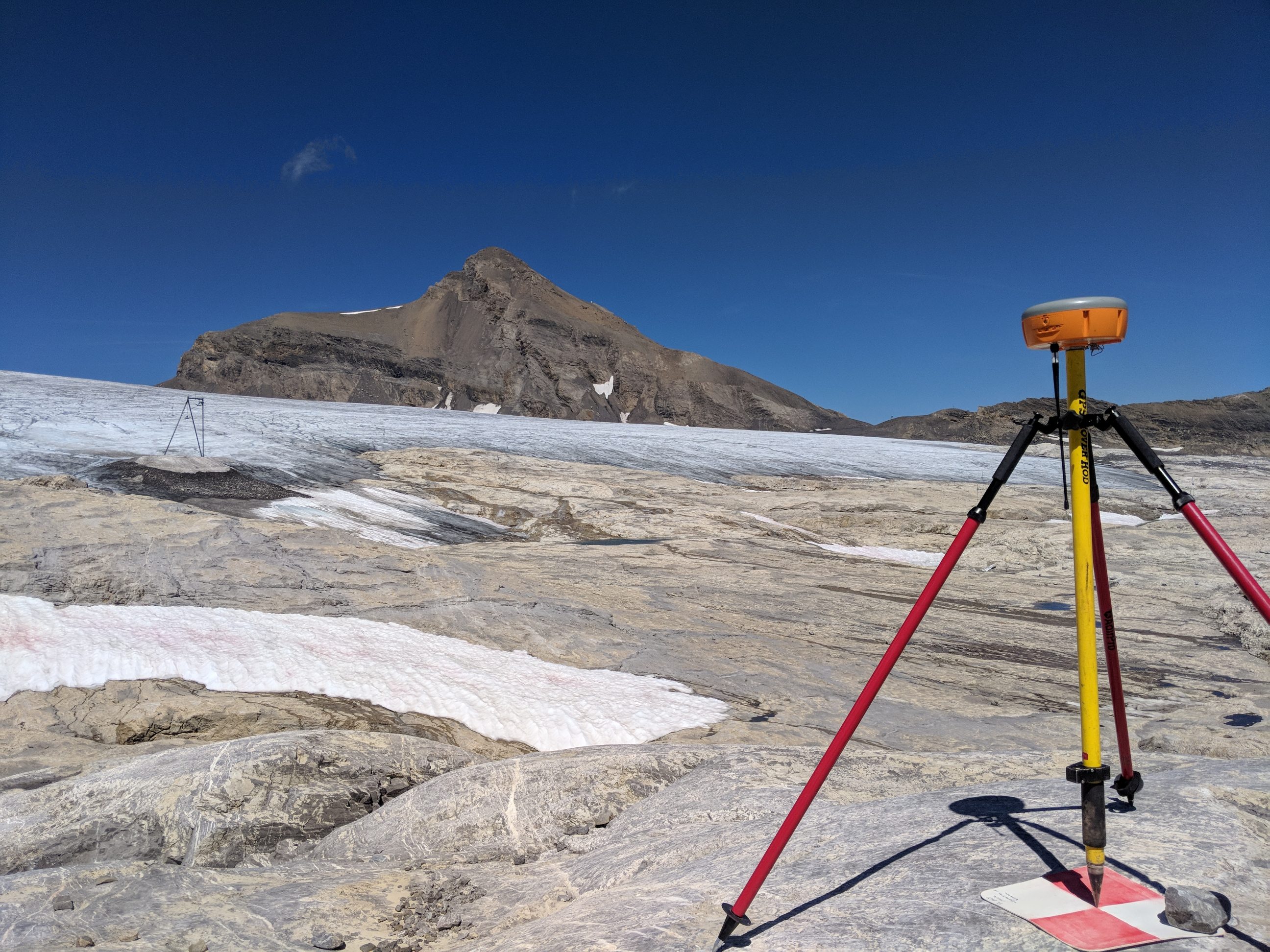 The team's GPS unit is set up for a survey in front of the Tsanflueron Glacier, Switzerland.