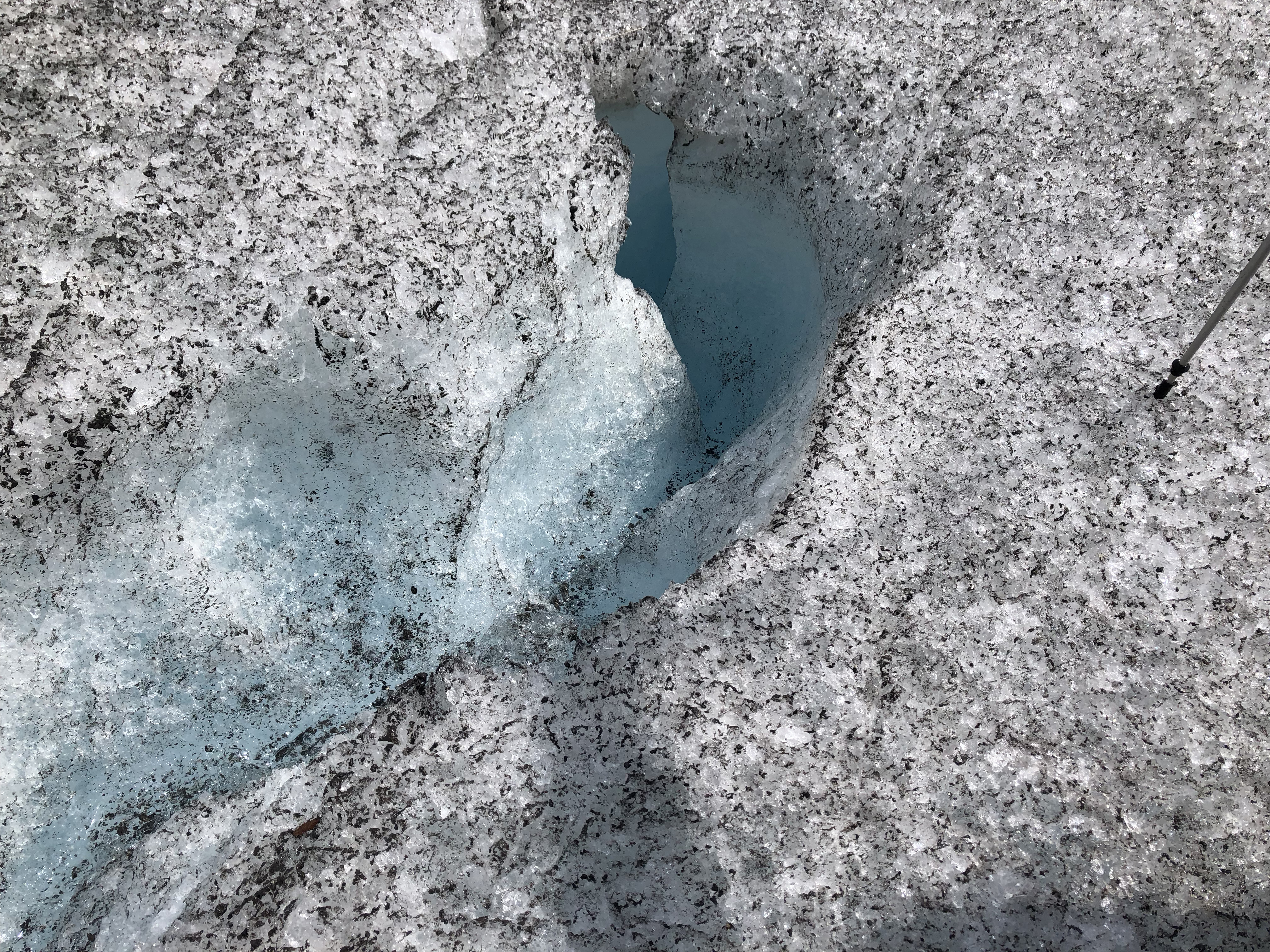 A moulin with water flowing into it on top of Rhône Glacier, Switzerland.