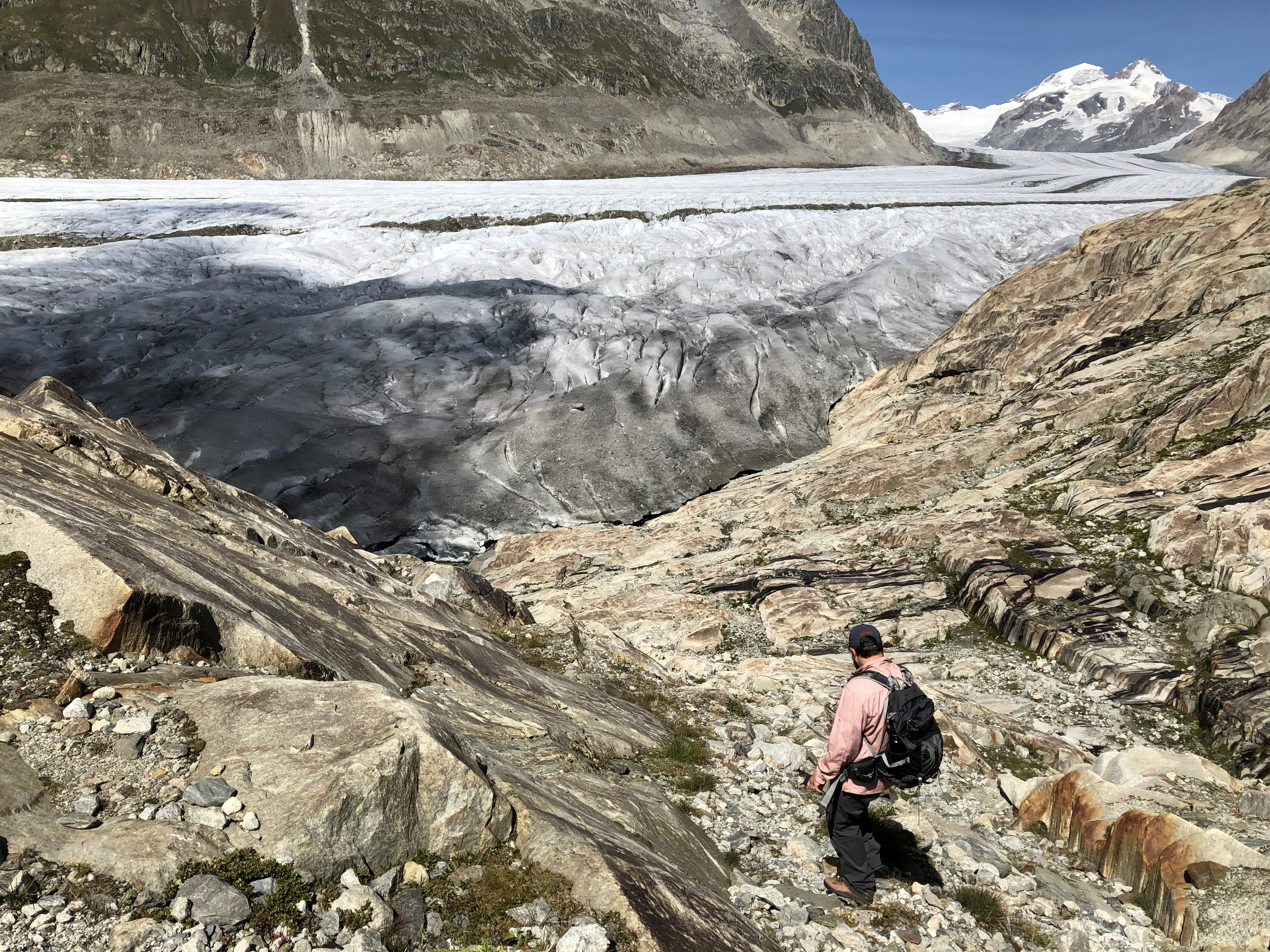 Dr. Luke Zoet hikes in the forefield of the Aletsch Glacier to conduct a survey. Aletsch Glacier, Switzerland.