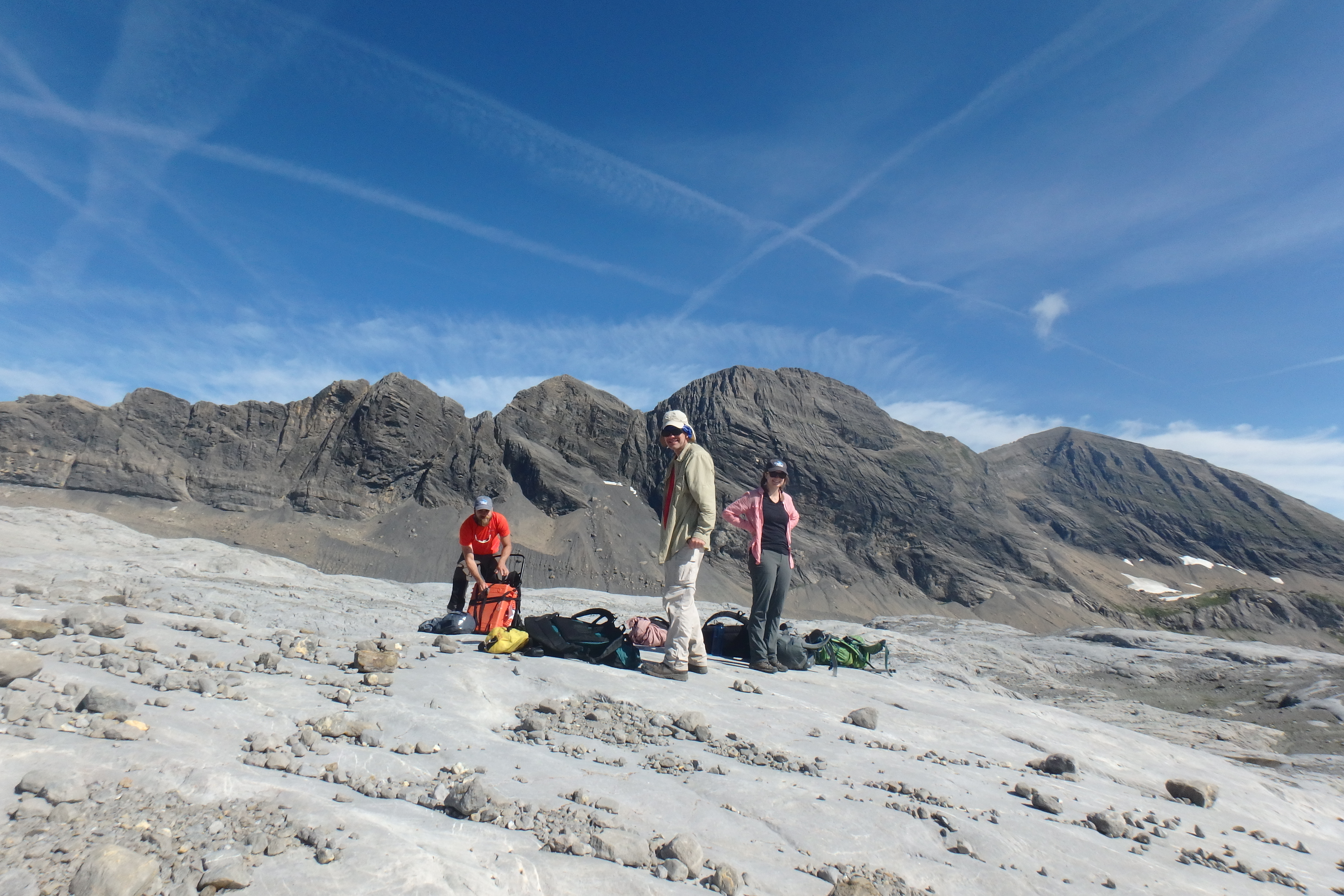 The team makes it to the center of the survey area and prepares the field equipment to begin the survey at Tsanflueron Glacier, Switzerland.