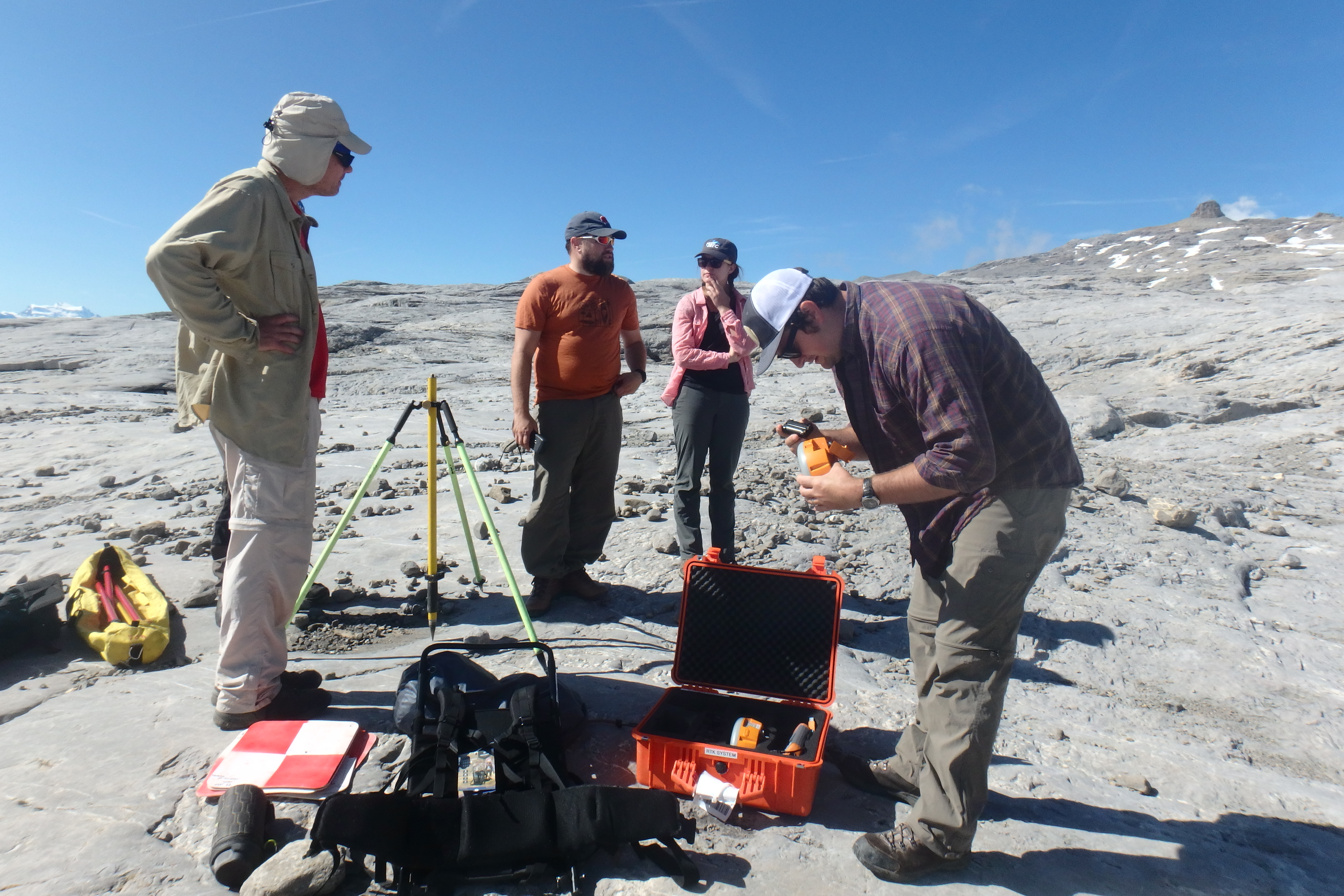 The team sets up the base GPS unit to start the drone survey at Tsanflueron Glacier, Switzerland.